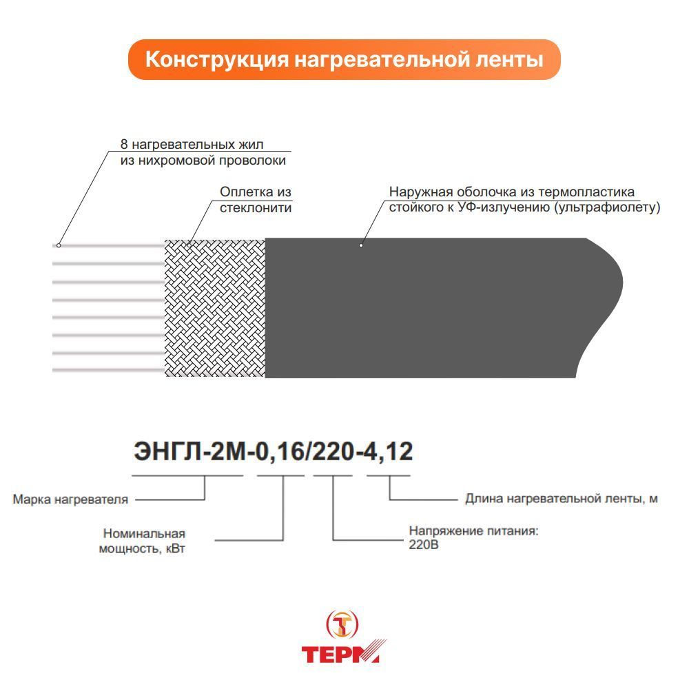Нагревательная лента ЭНГЛ-2М защищает от появление наледи на кровле или внутри водосточных желобов. Основные преимущества данной модели — прочность, отличная защита от УФ–лучей, экономичность и долговечность. Эти системы обогрева кровли монтируют даже зимой, поскольку их укладку можно выполнять при температуре до -50 °C.