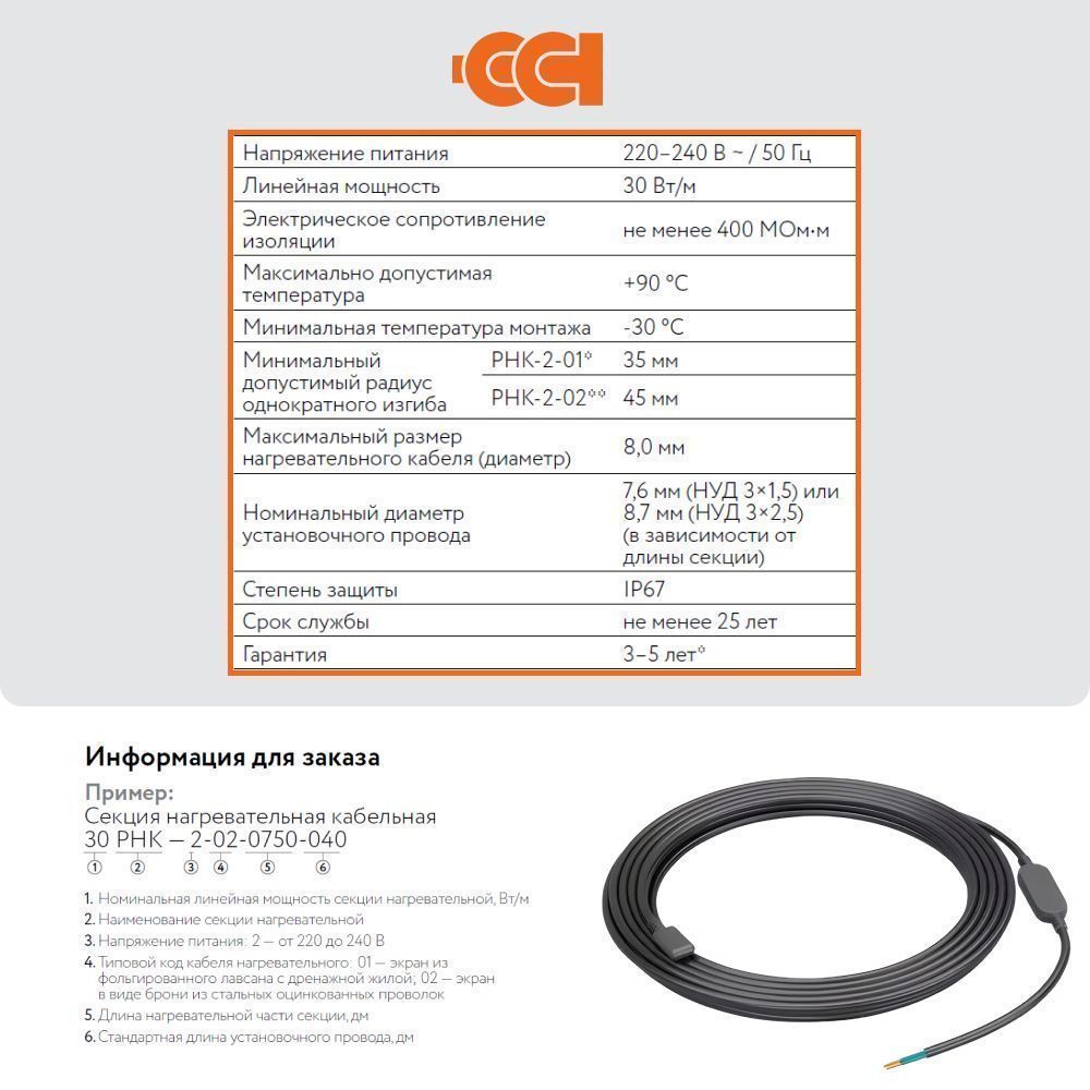 - Мощность кабеля обеспечивает равномерный нагрев на всем участке монтажа, диапазон рабочих температур от -30 до +90 ℃, что делает возможным применение секций РНК в различных климатических условиях. Также фторполимерная изоляция выдерживает температуру до 150 °С. Конструкция кабеля и применение высококачественных материалов обеспечивает 100% электробезопасность;