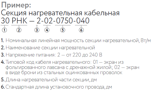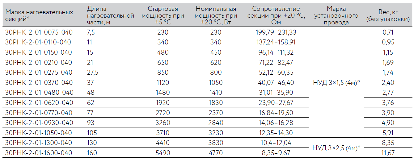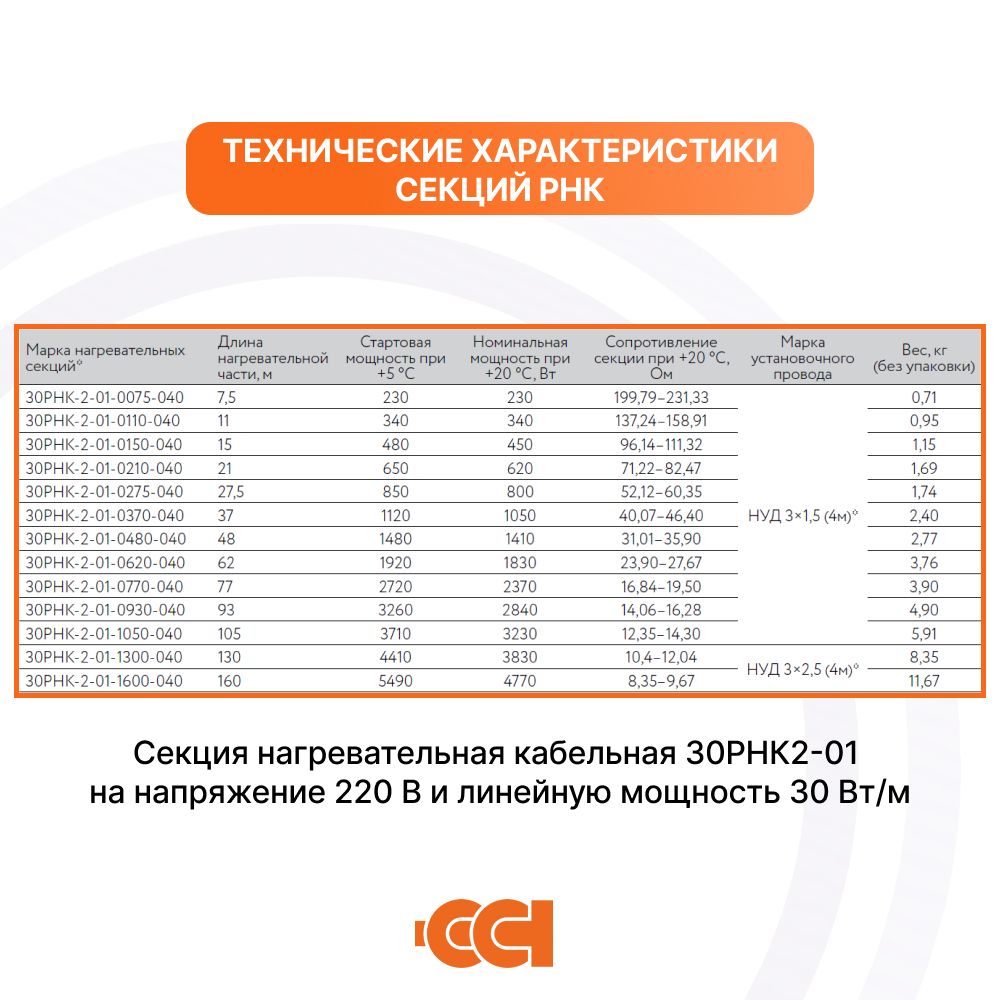 Характеристики нагревательной кабельной секции 30РНК-2-01: