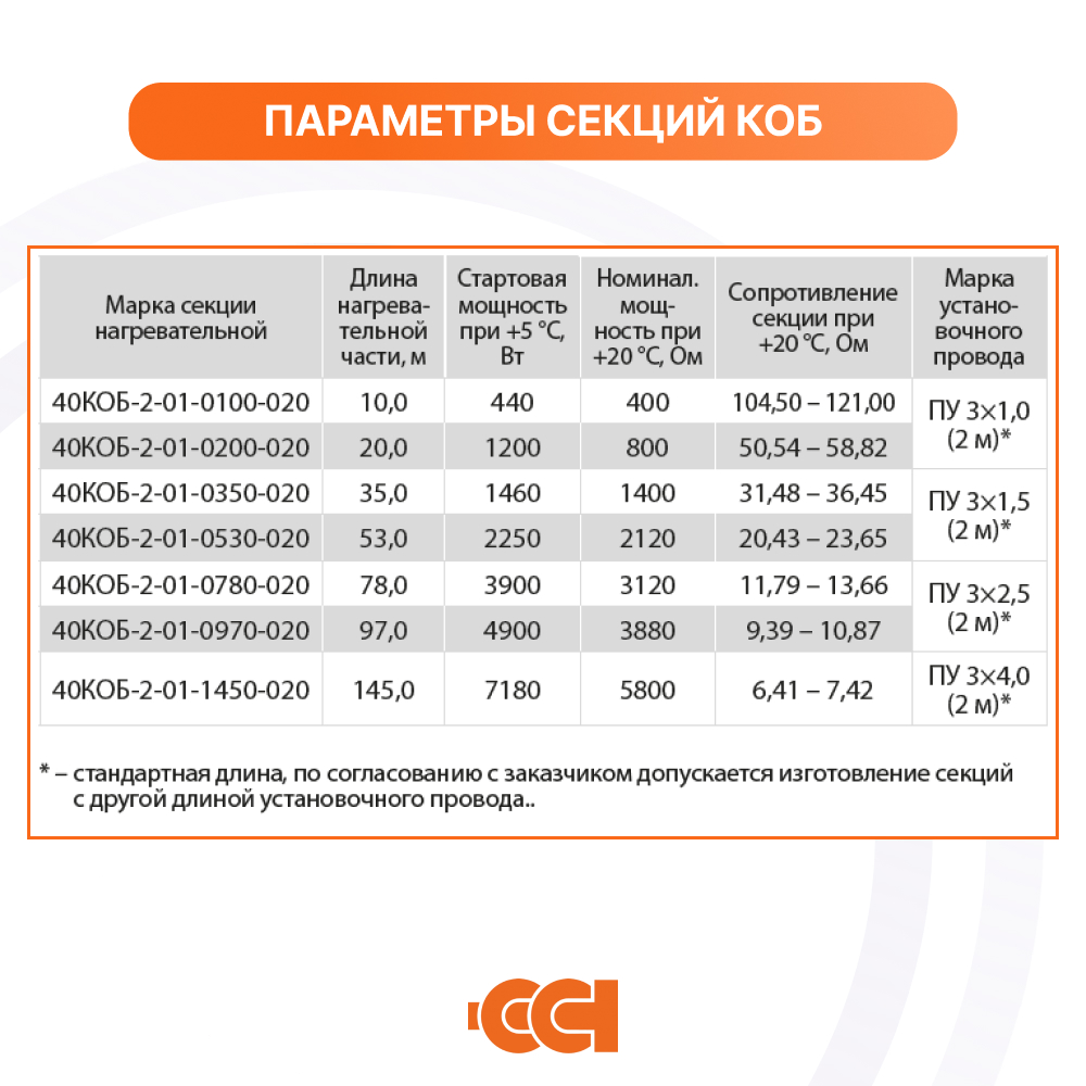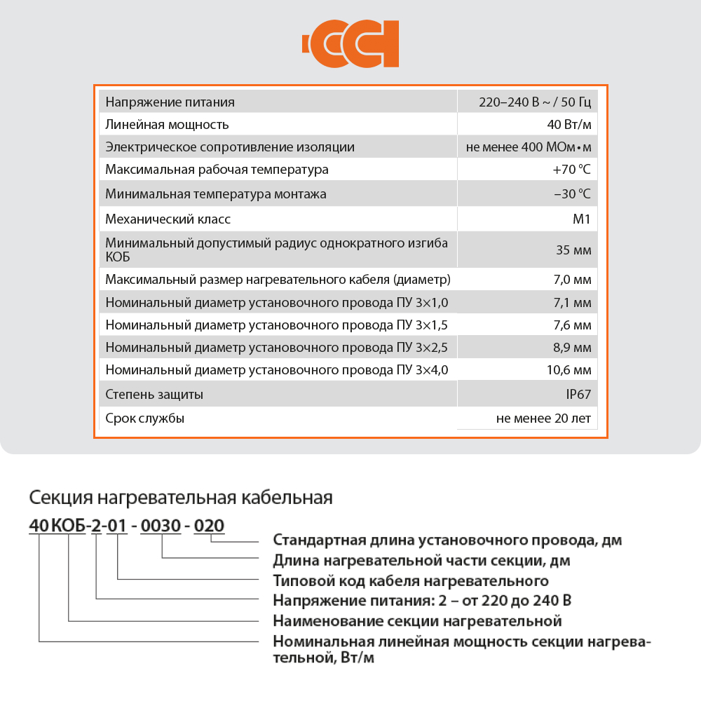 Секция КОБ состоит из двухжильного кабеля, соединенного с одной стороны с установочным проводом при помощи соединительной муфты, с концевой муфтой на другой стороне секции. Муфты обеспечивают надежную герметичность соединения. Мощность кабеля обеспечивает равномерный нагрев на всем участке монтажа, диапазон рабочих температур от -30 до +70 ℃, поэтому даже в условиях холодного климата применение конструкции обеспечивает быстрое и равномерное застывание бетона. Еще одним неоспоримым преимуществом кабеля является простой монтаж без необходимости использования трансформатора и дополнительного дорогостоящего оборудования.