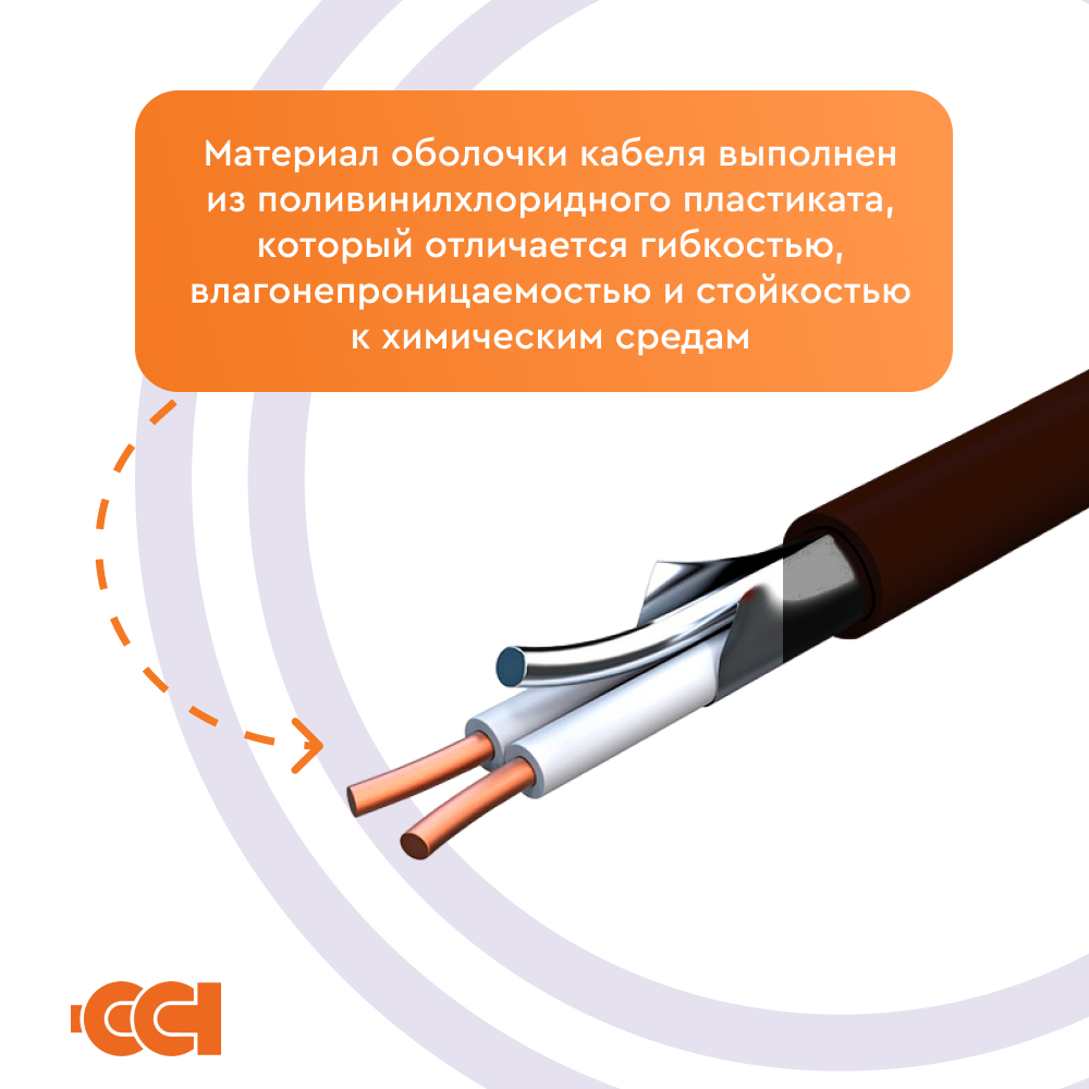 - Материал оболочки кабеля выполнен из поливинилхлоридного пластиката, который отличается гибкостью, влагонепроницаемостью и стойкостью к химическим средам;