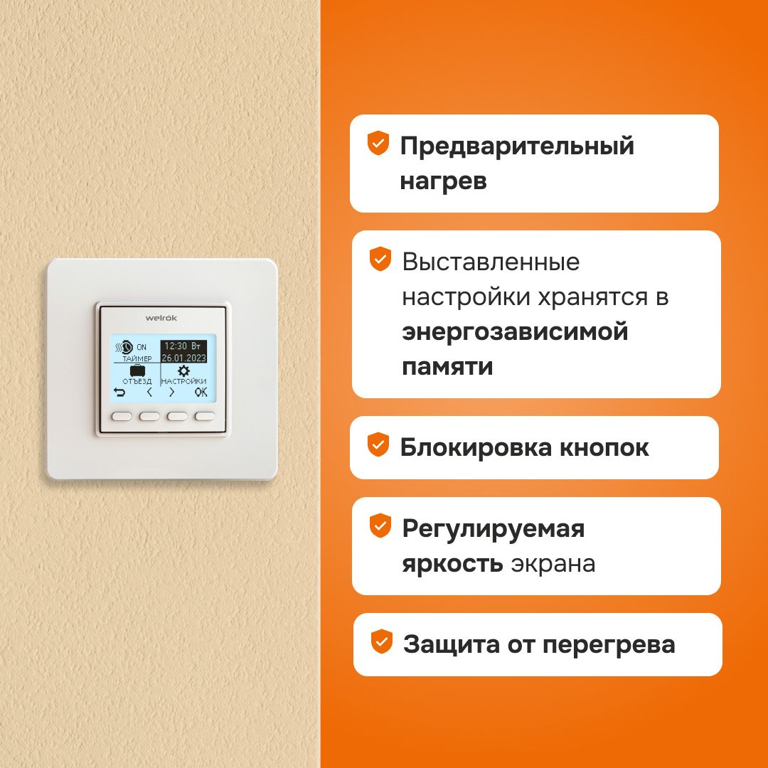 - Энергонезависимая память терморегулятора Welrok pro сохраняет все настройки и расписание нагрева в случае отсутствия напряжения
