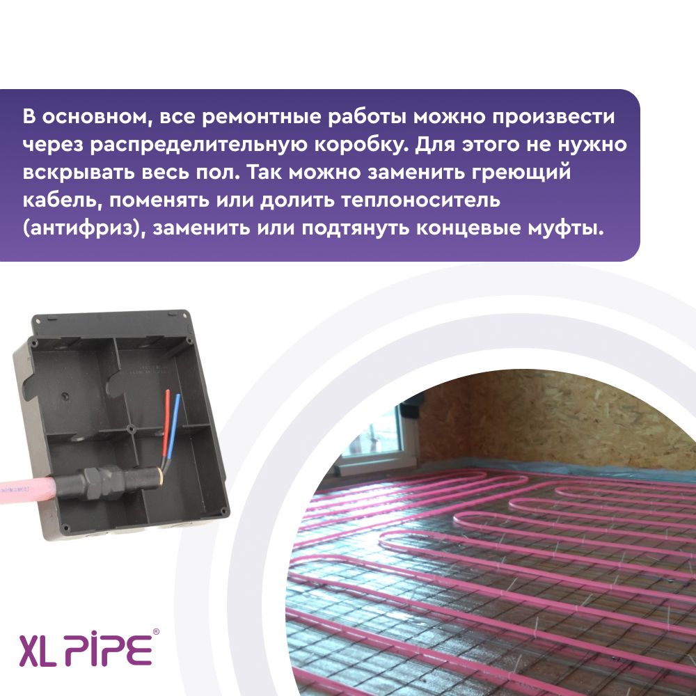 - Все ремонтные работы можно произвести через распределительную коробку. Для этого не нужно вскрывать весь пол. Так можно заменить греющий кабель, поменять или долить теплоноситель (антифриз), заменить или подтянуть концевые муфты;