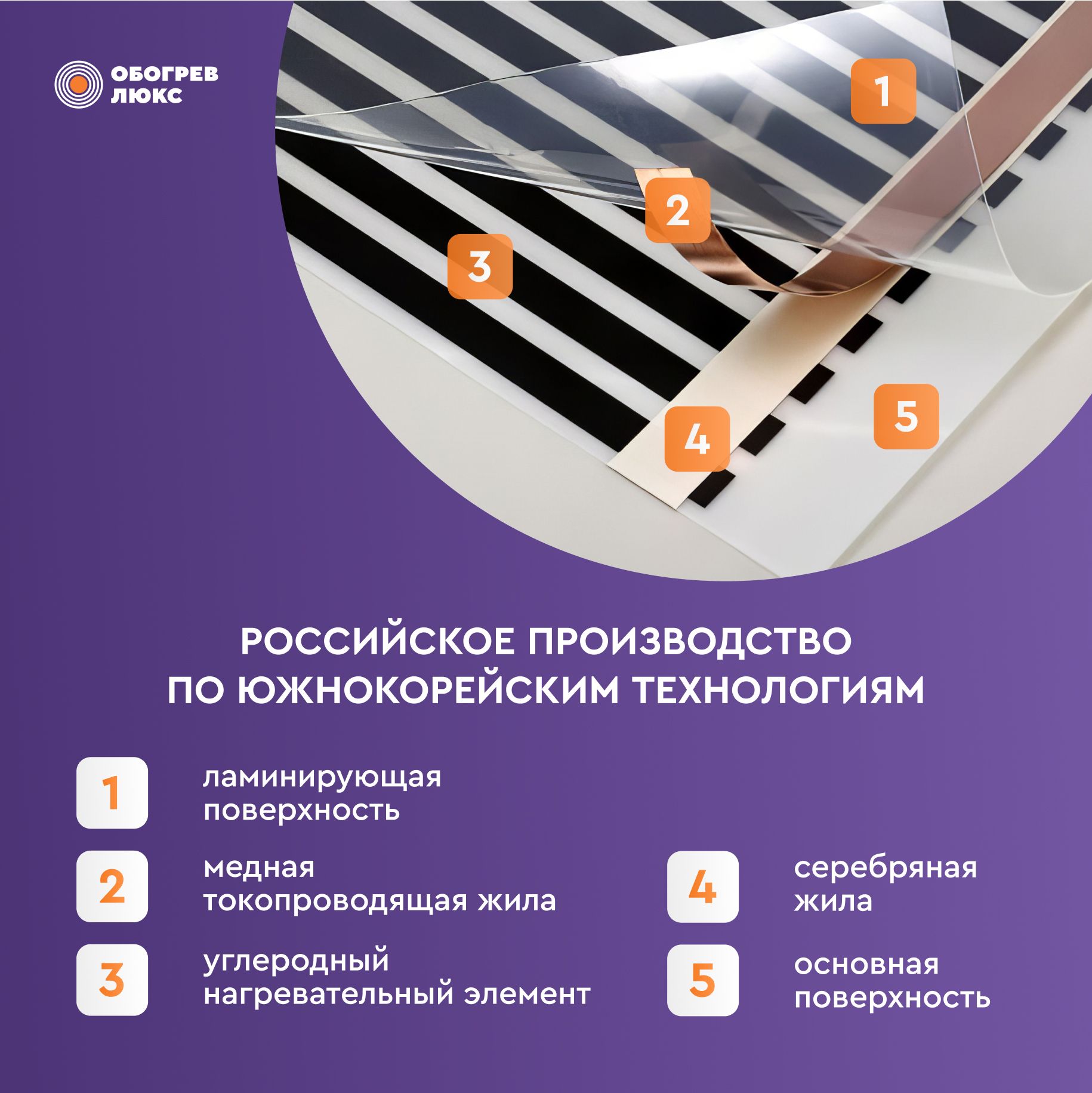 Состоит тонкий пол из защитной прозрачной пленки и плоских тепловыделяющих карбоновых элементов с токопроводящими медными лентами, нанесенных на полимерную основу.