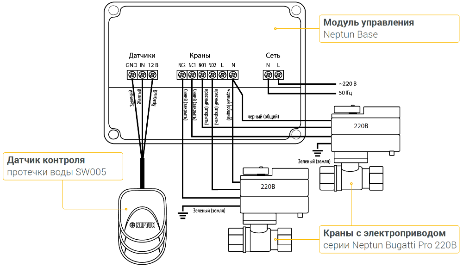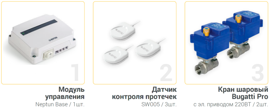 Система контроля протечки воды Neptun Base предназначена для своевременного обнаружения и локализации протечек воды в системе водоснабжения и отопления жилых домов, коттеджей, офисных зданий, магазинов. Система заблокирует подачу воды до устранения причин протечки и проинформирует о возникшей аварии звуковым и световым сигналами.