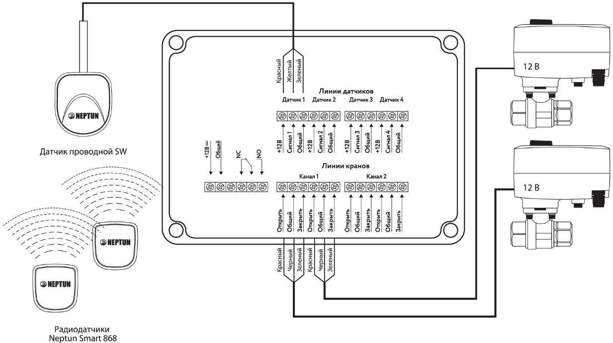 - Автоматическая блокировка водоснабжения при срабатывании любого датчика