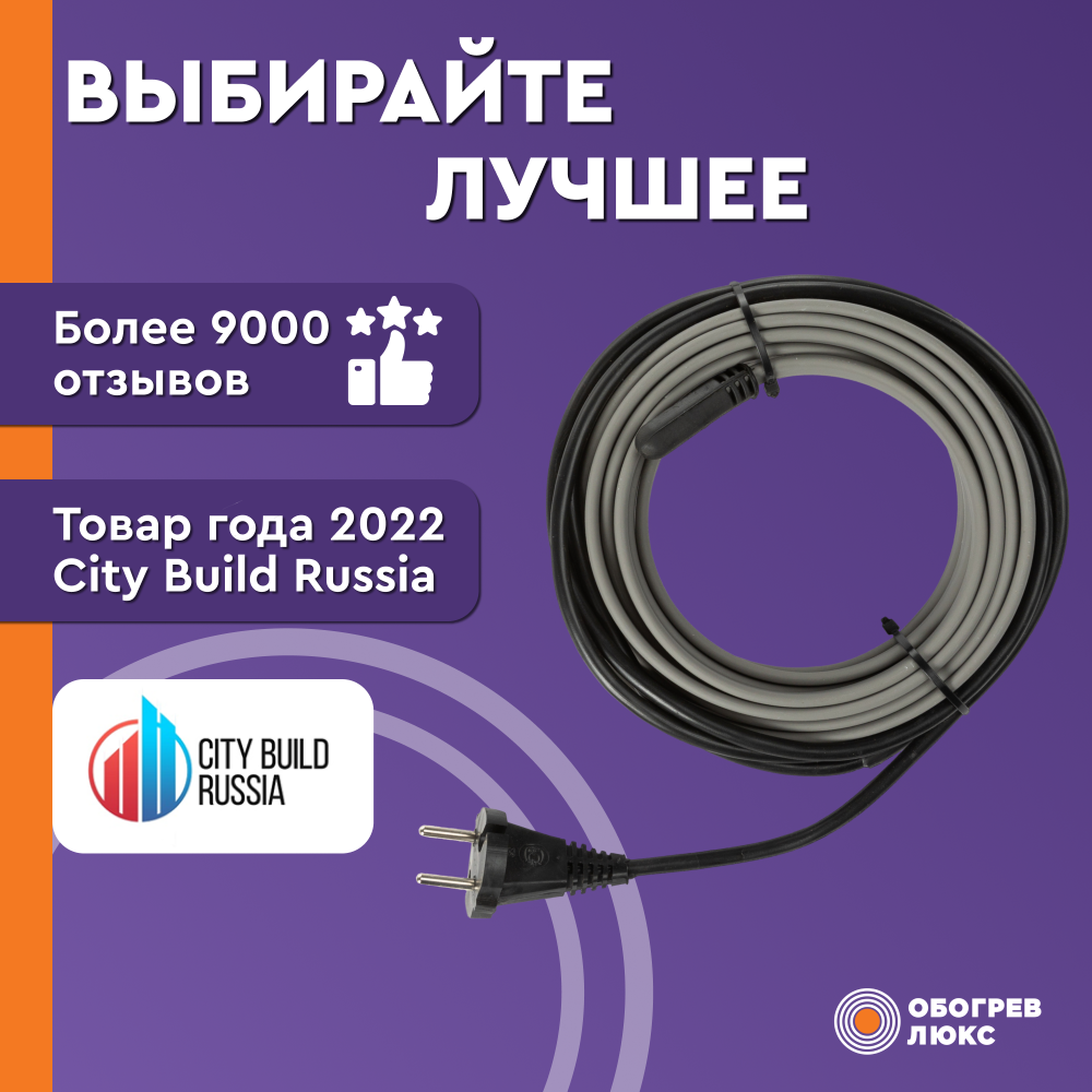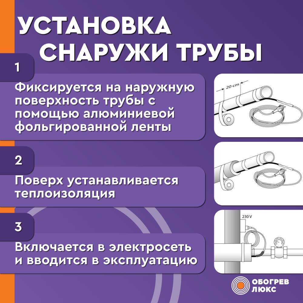 - Простой монтаж. Кабель устанавливается на трубу и подключается к розетке.