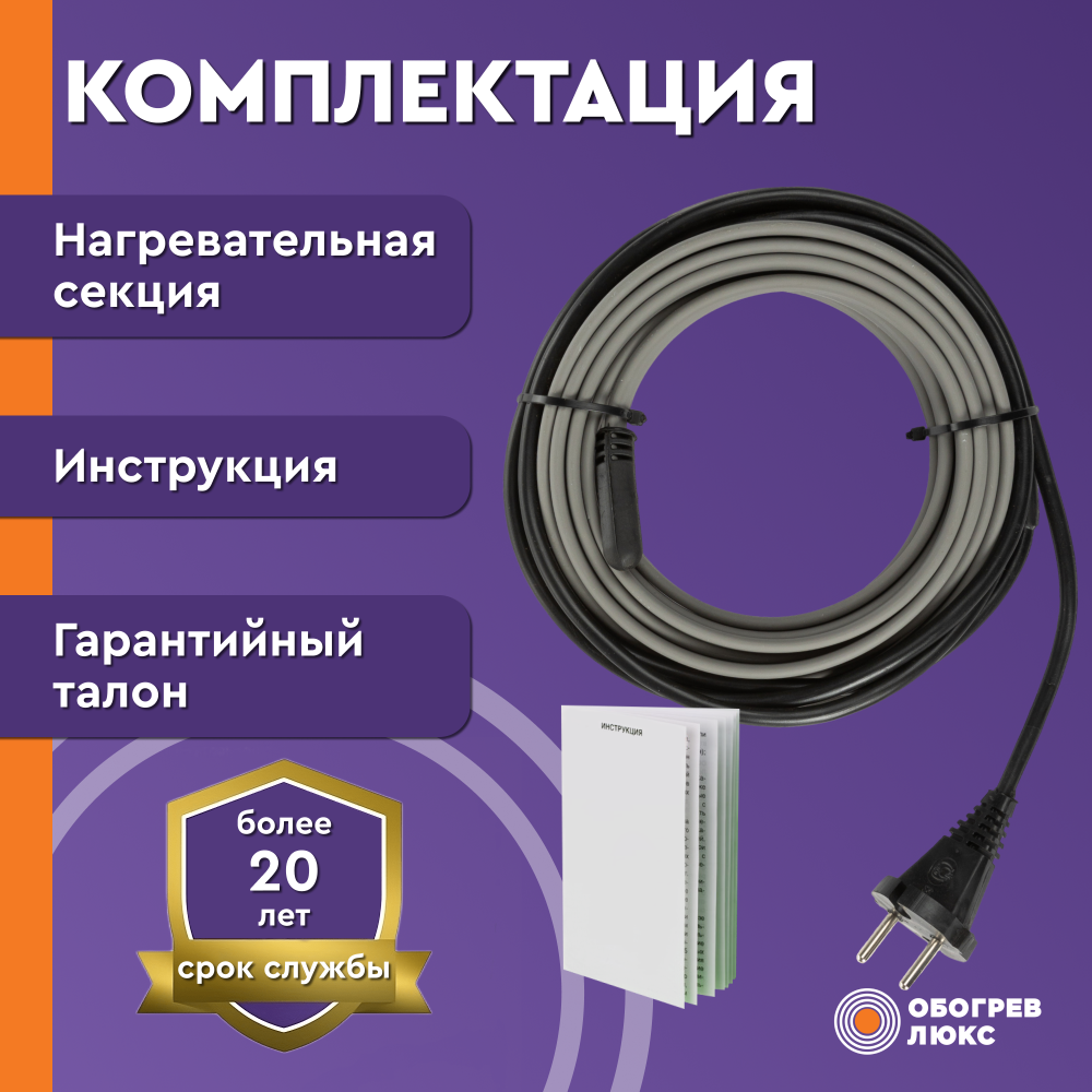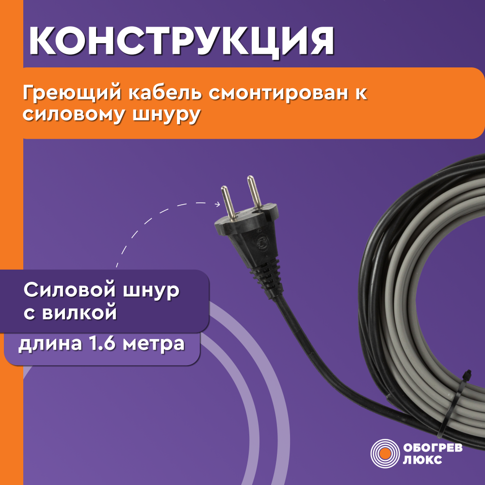 - Нагревательная секция из саморегулирующегося греющего кабеля PSK 16-2, мощностью 16 Вт/м с силовым проводом и вилкой