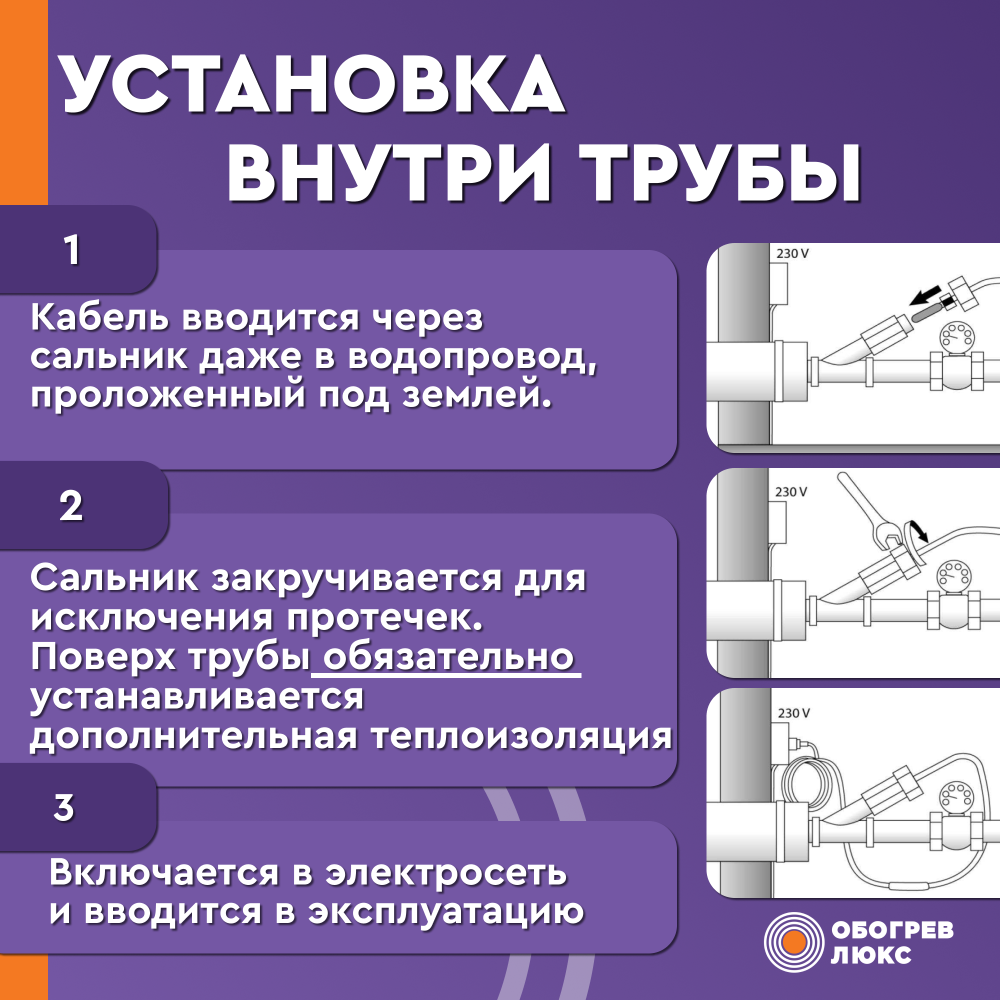 - Экономичность. Во-первых, электроэнергия расходуется только на тех участках водопровода, температура которых приближается к нулю, и только тогда, когда это необходимо. Во-вторых, энергия не тратится на обогрев окружающего воздуха, поскольку кабель находится внутри трубы.
