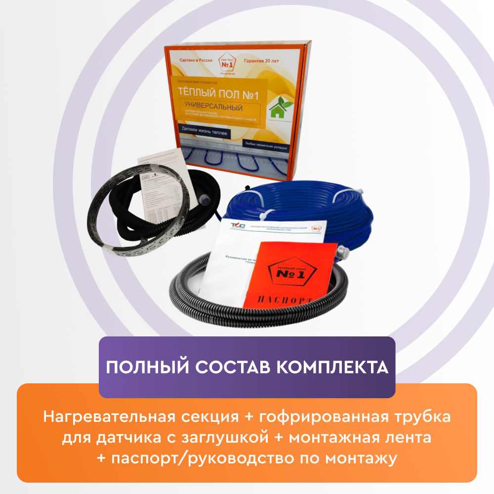 Нагревательная секция Теплый пол №1 является универсальной благодаря минимальному диаметру кабеля, что позволяет укладывать ее, как в слой плиточного клея, так и в цементно-песочную стяжку.