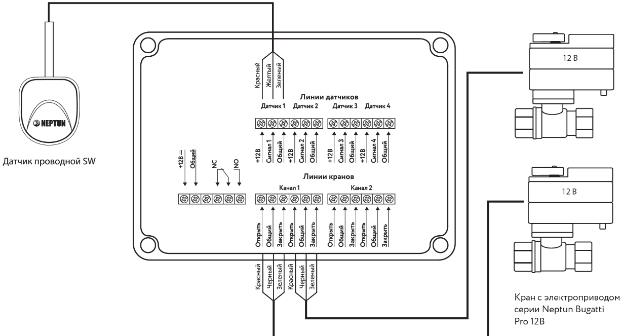 - Автоматическая блокировка водоснабжения при срабатывании любого датчика