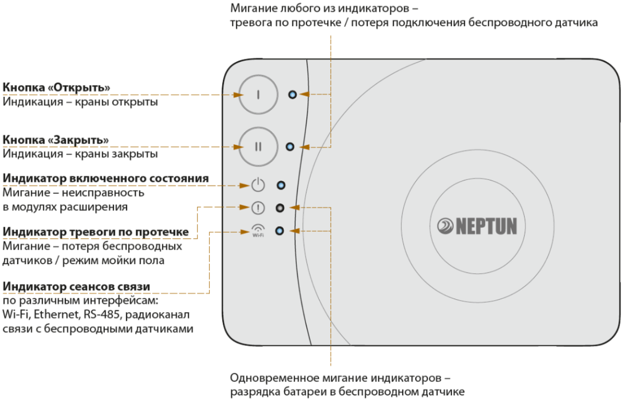 Предназначен для обработки сигналов от датчиков контроля протечки воды и выдачи управляющего сигнала на исполнительное устройство (шаровый кран с электроприводом), перекрывающее воду. В базовой комплектации поддерживает только проводные датчики.