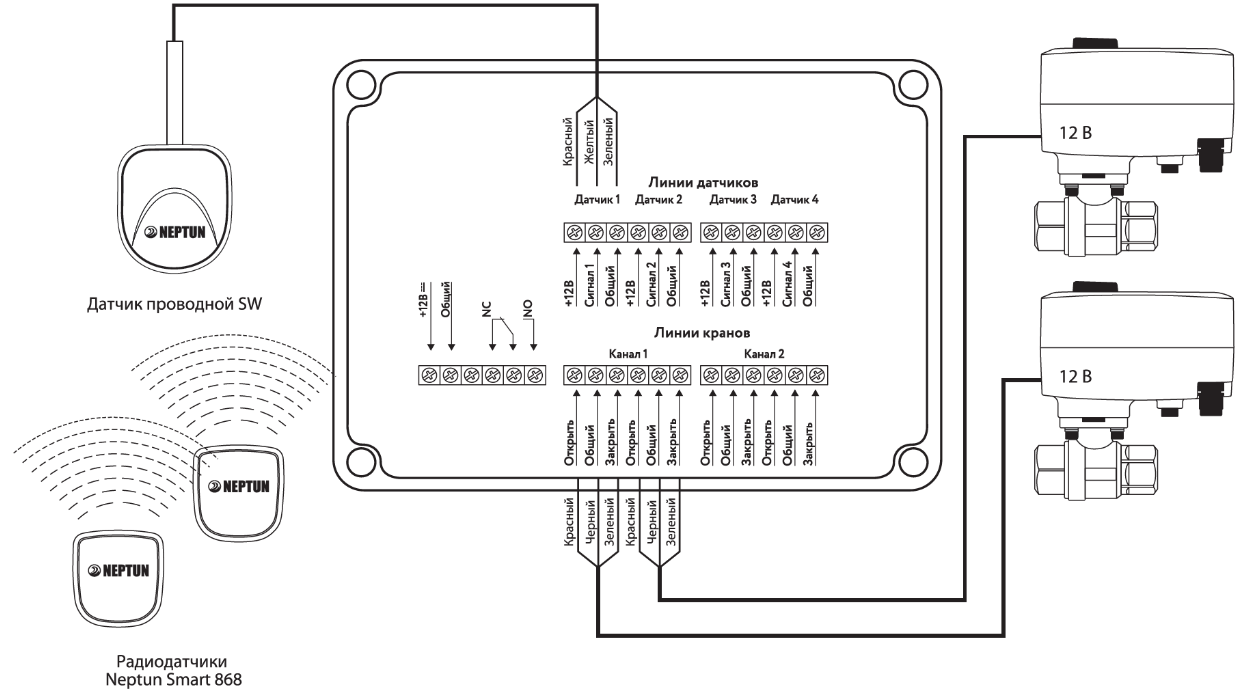 - Автоматическая блокировка водоснабжения при срабатывании любого датчика