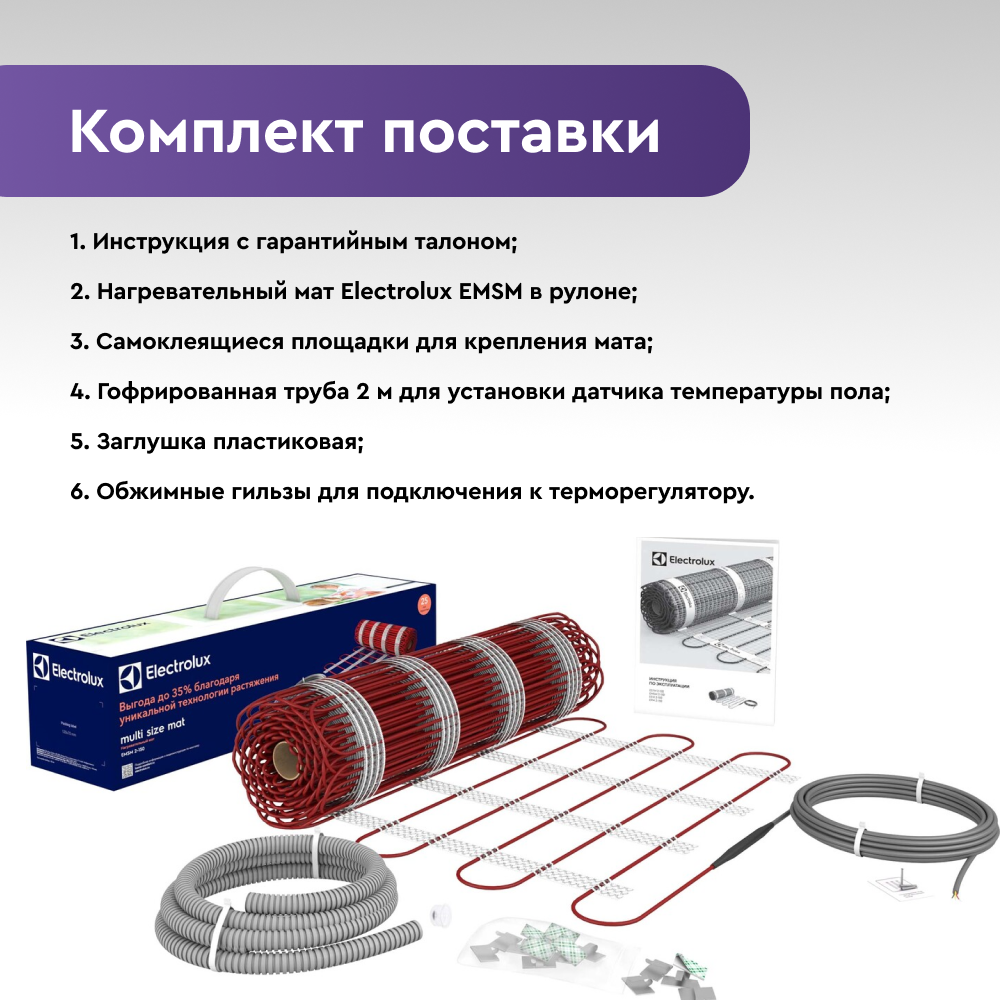 1. Инструкция с гарантийным талоном;2. Нагревательный мат Electrolux EMSM в рулоне;