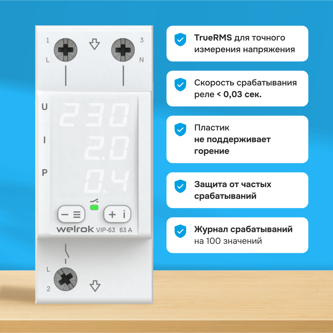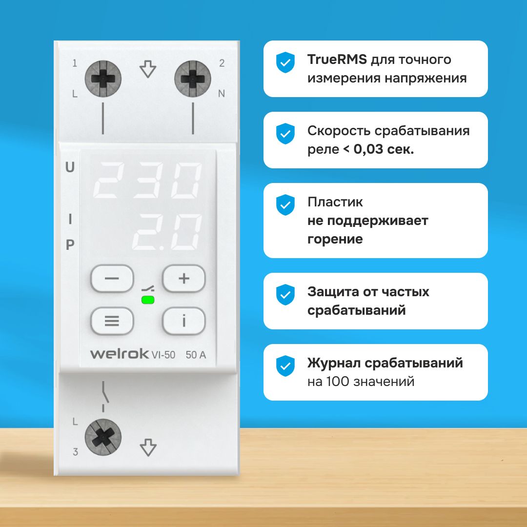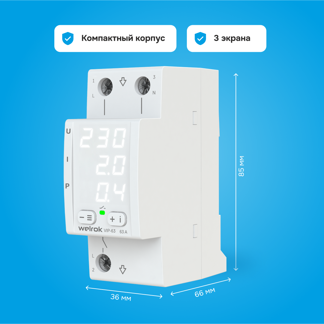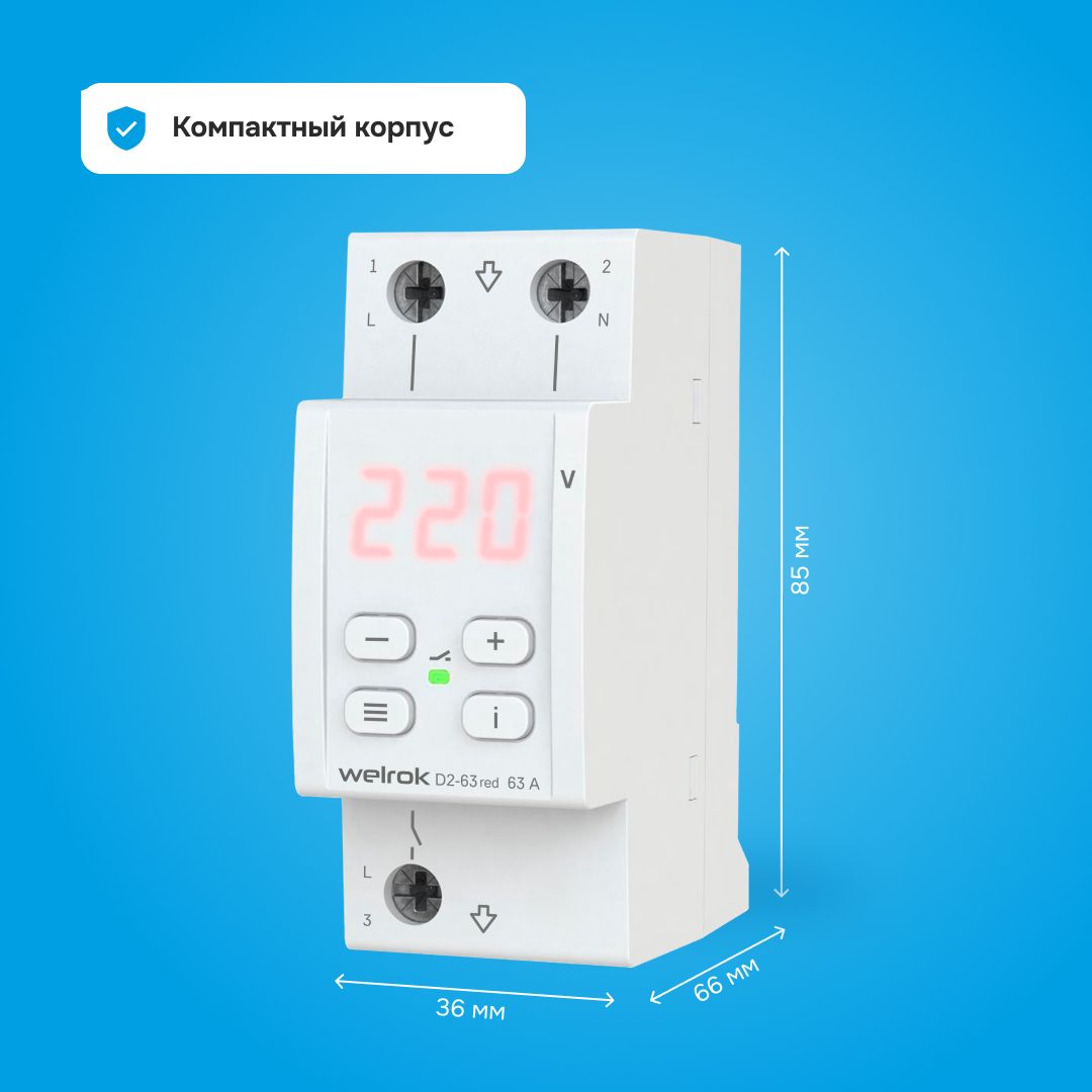 - Welrok D2 — компактное реле на 2 модуля с мощным функционалом: скорость срабатывания реле < 0,03 сек.,TrueRMS для точного измерения напряжения;