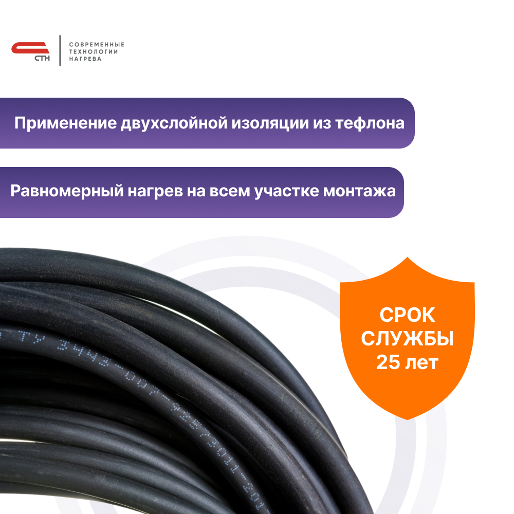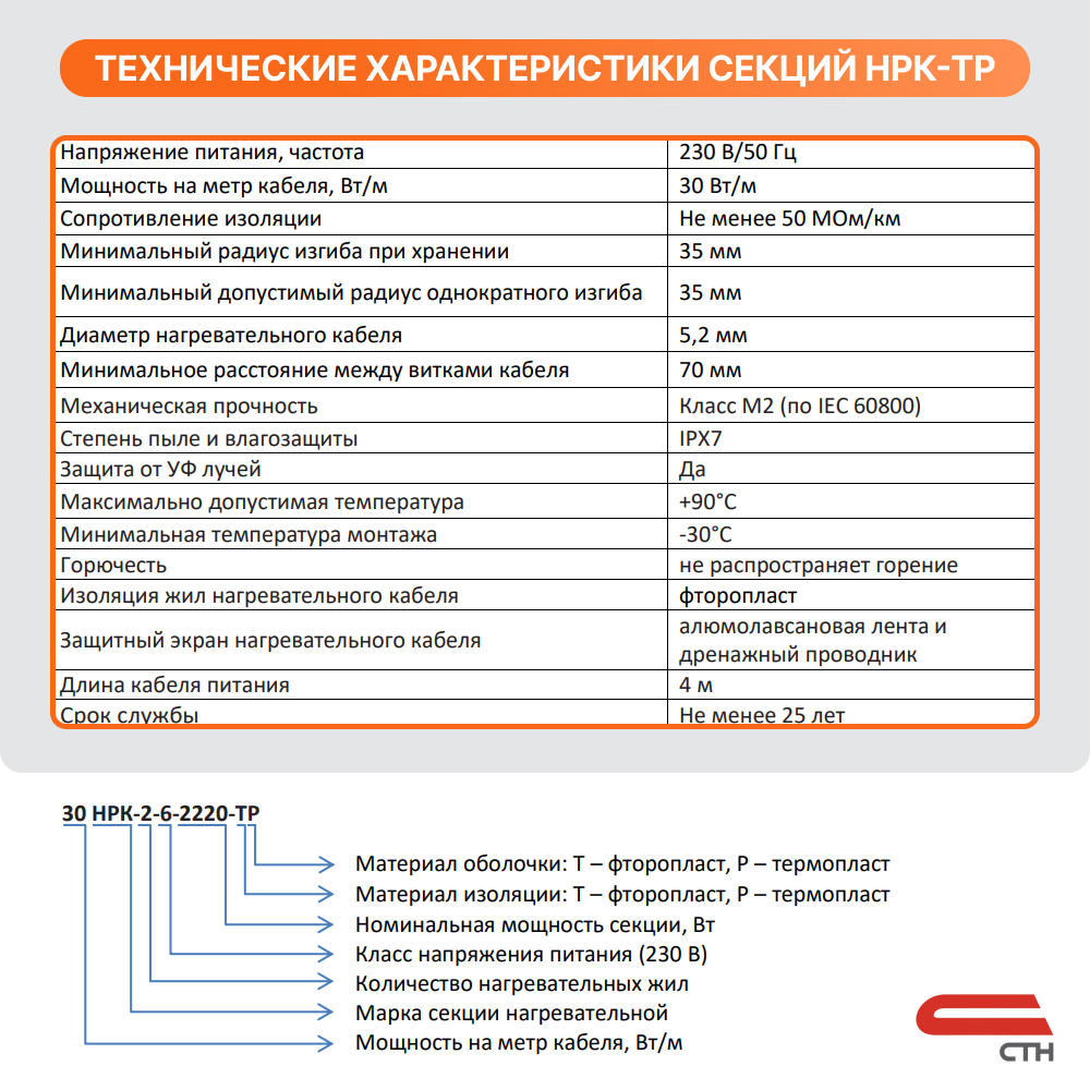 Секция 30 НРК 2-6-4500-ТР состоит из двухжильного нагревательного кабеля постоянного сопротивления (резистивного типа) определенной фиксированной длины, с одной стороны которого установлена концевая муфта, а с другой — соединительная муфта, с помощью которой нагревательный кабель соединяется с кабелем питания длиной 4 метра. Внутренняя изоляция из фторопласта обеспечивает высокую стойкость к высоким температурам, агрессивным средам, а также защищает кабель от перегрева, продлевая срок его эксплуатации. Армирующая нить придает кабелю дополнительную механическую прочность, защищая его от возможных повреждений при укладке. А усиленная оболочка с повышенной термостойкостью защищает кабель от воздействия УФ-лучей и внешних механических воздействий, гарантируя его долговечность. Срок службы секции НРК-ТР составляет не менее 25 лет.