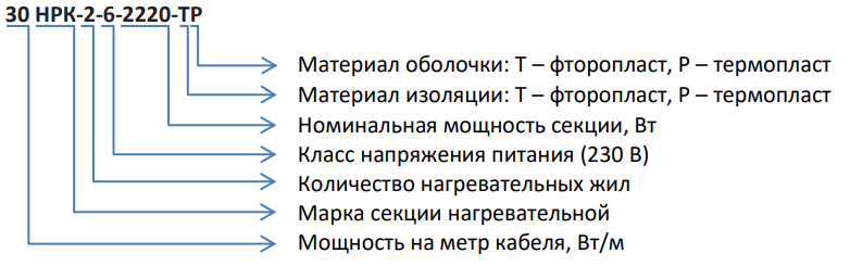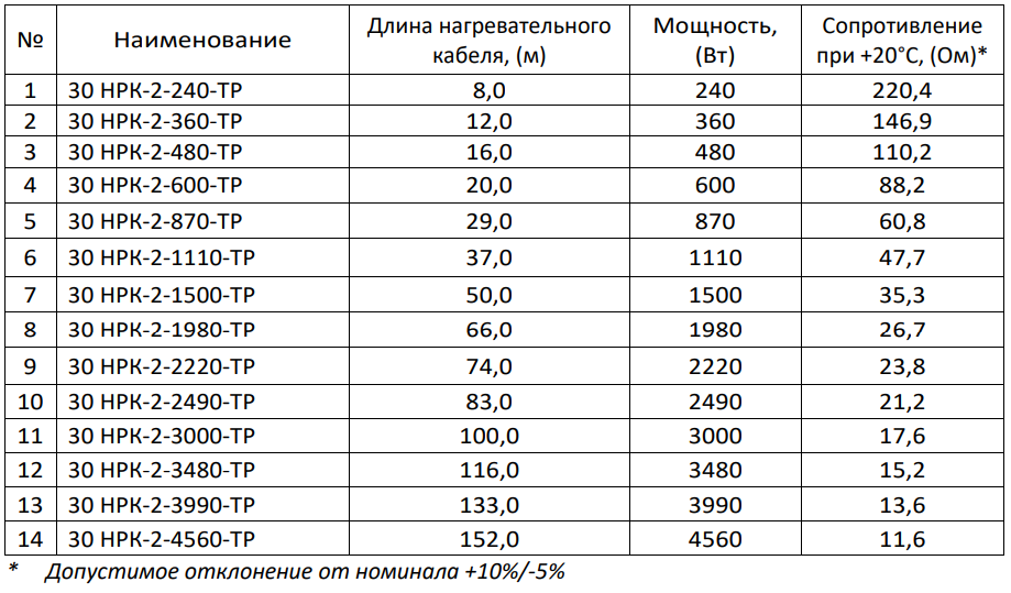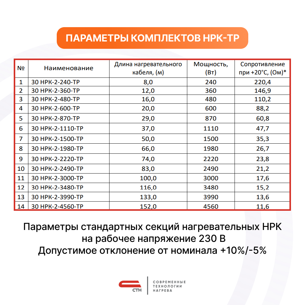 Параметры стандартных секций нагревательных НРК-ТР на рабочее напряжение 230 В.