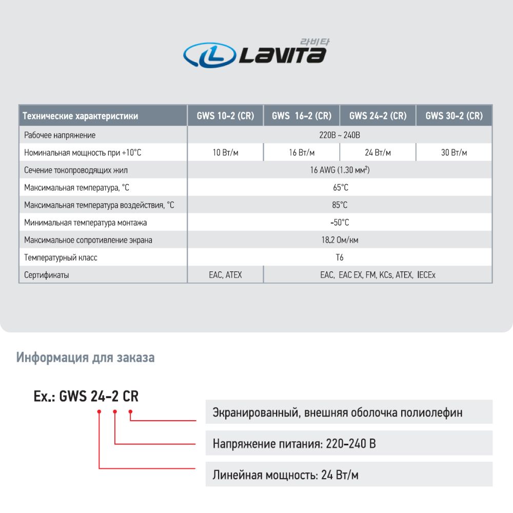 Саморегулирующийся греющий кабель LAVITA GWS30-2CR предназначен для защиты от замерзания и поддержания температуры процесса металлических и неметаллических трубопроводов, емкостей и оборудования до 65°С.