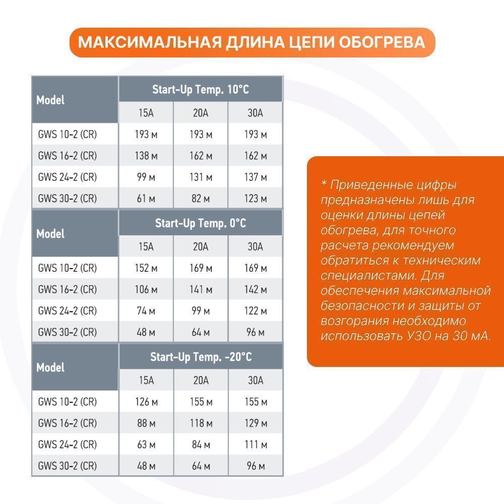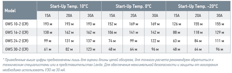 Максимальная длина нагревательной секции нагревательного кабеля LAVITA GWS рассчитывается, исходя из температуры включения и типа автоматического выключателя питания.