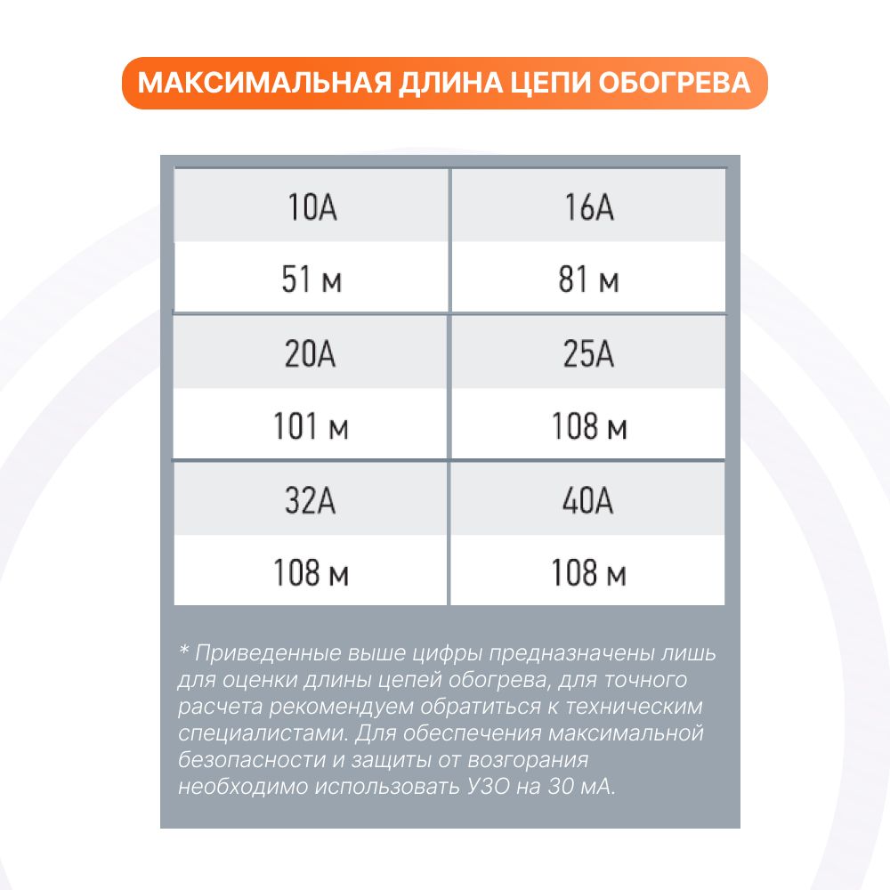 Максимальная длина нагревательной секции нагревательного кабеля LAVITA HPI 12-2 CT рассчитывается, исходя из температуры включения и типа автоматического выключателя питания.