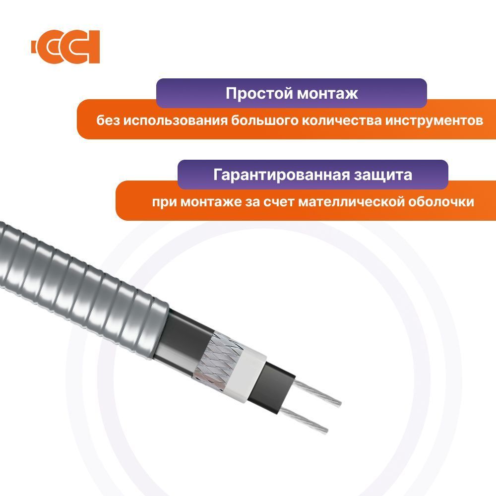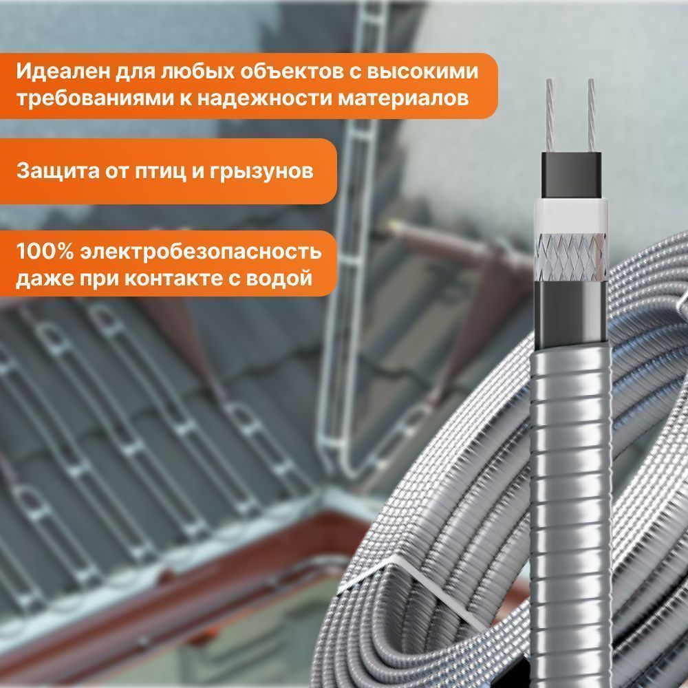 - При обогрева водостоков не требует металлического троса — кабель обладает достаточным запасом прочности, гарантирующей целостность и стабильную работу под нагрузками;