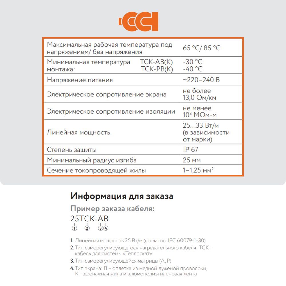Основой саморегулирующегося греющего кабеля ССТ 25ТСК-РВ служит полупроводящая матрица с частицами графита, внутри которой расположены две токопроводящие медные жилы. Выделение тепла происходит в полупроводящей матрице, сопротивление которой зависит от температуры поверхности, что обеспечивает эффект саморегулирования (при повышении температуры сопротивление матрицы возрастает, тепловыделение падает и наоборот). Благодаря этому свойству, саморегулирующийся греющий кабель ССТ 25ТСК-РВ не будет перегреваться и перегорать даже когда его отдельные участки накладываются друг на друга.