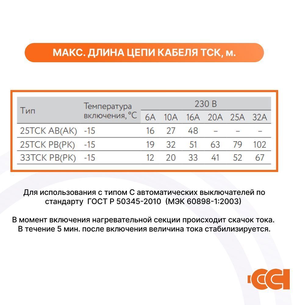 Максимальная длина нагревательной секции нагревательного кабеля ССТ ТСК рассчитывается, исходя из температуры включения и типа автоматического выключателя питания: