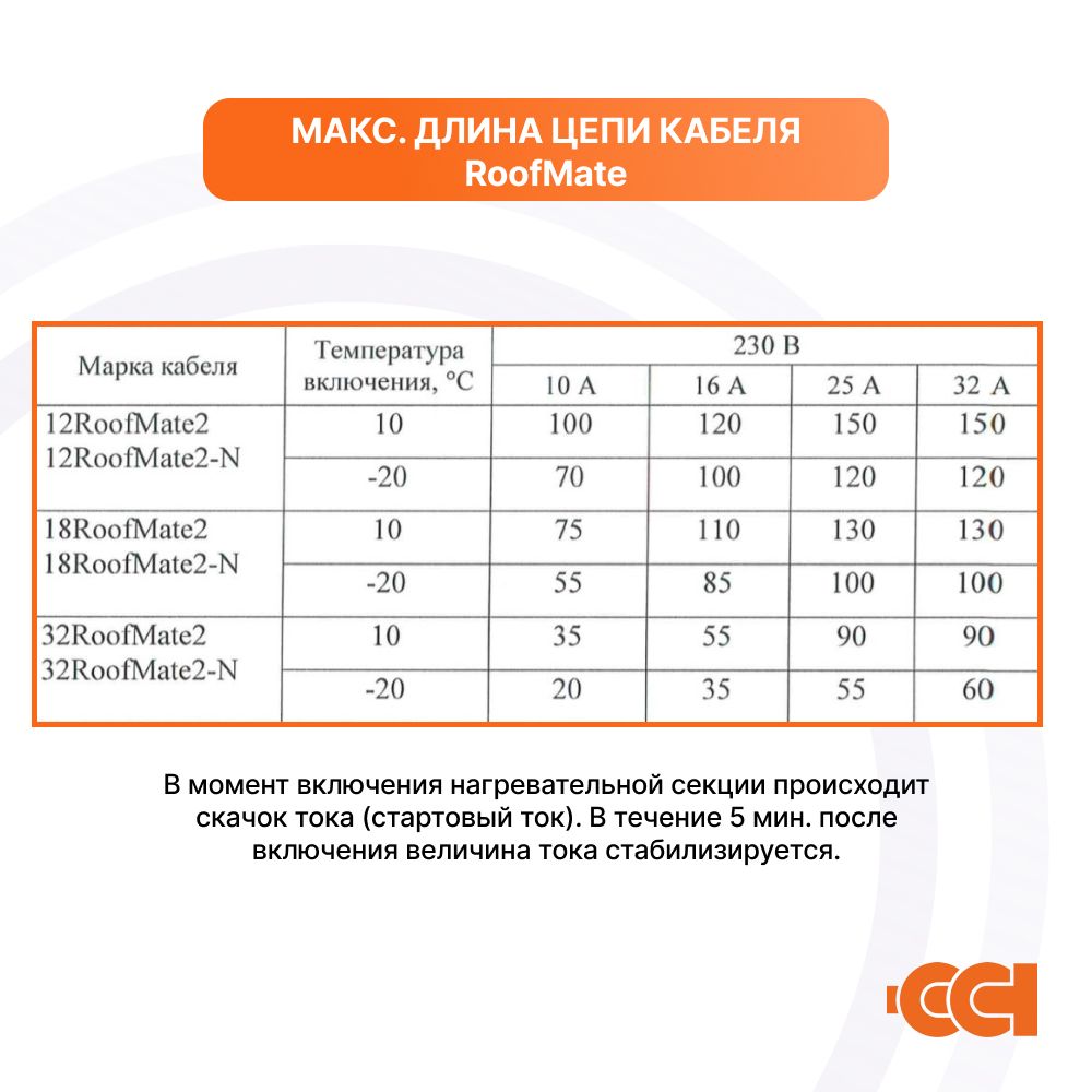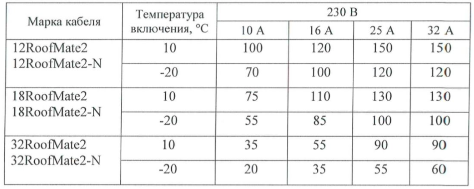 Максимальная длина нагревательной секции нагревательного кабеля ССТ RoofMate рассчитывается, исходя из температуры включения и типа автоматического выключателя питания: