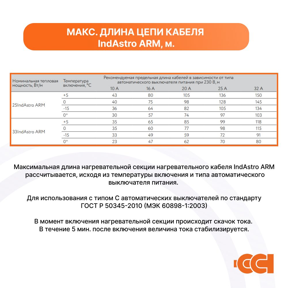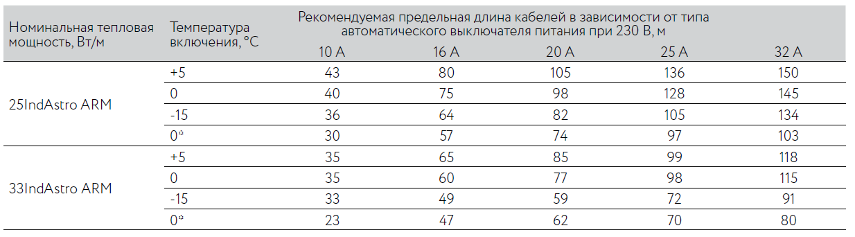 Максимальная длина нагревательной секции нагревательного кабеля ССТ IndAstro ARM рассчитывается, исходя из температуры включения и типа автоматического выключателя питания: