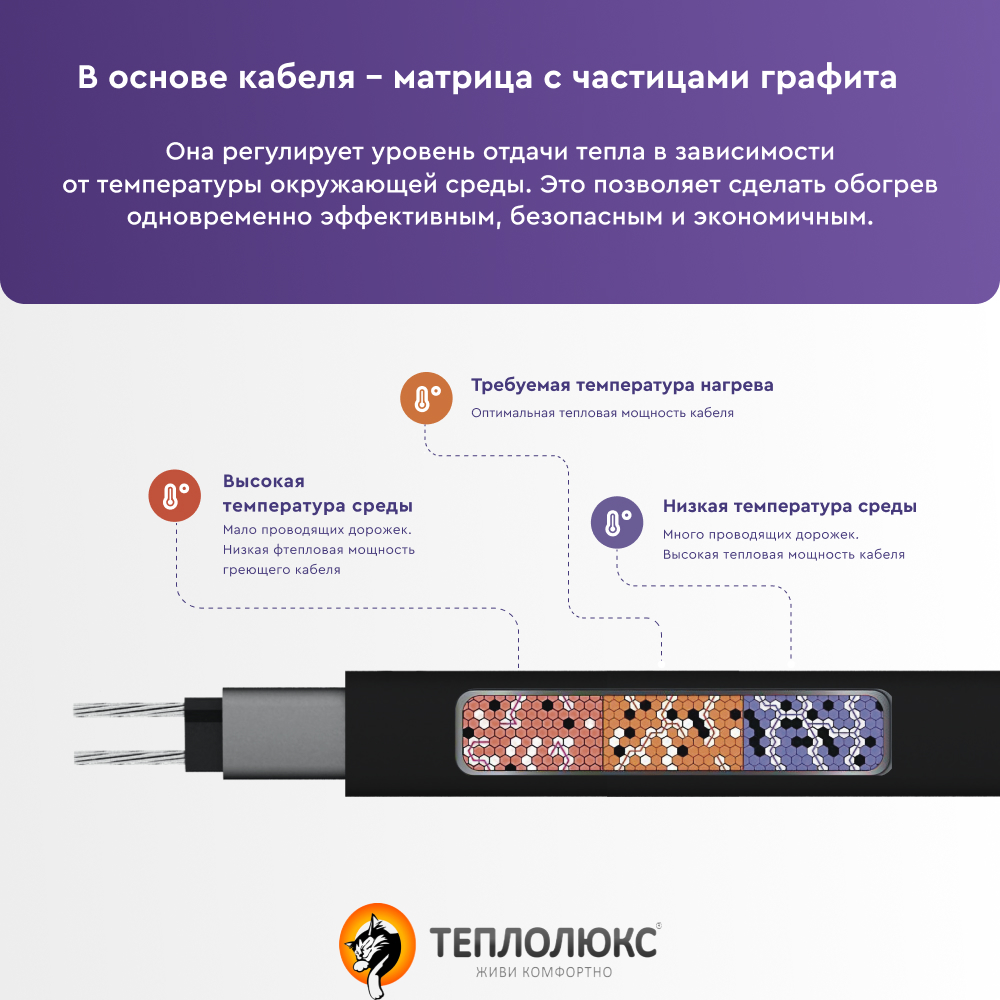 Основой саморегулирующегося греющего кабеля Freezstop-15 служит полупроводящая матрица с частицами графита, внутри которой расположены две токопроводящие медные жилы. Выделение тепла происходит в полупроводящей матрице, сопротивление которой зависит от температуры поверхности, что обеспечивает эффект саморегулирования (при повышении температуры сопротивление матрицы возрастает, тепловыделение падает и наоборот). Благодаря этому свойству, саморегулирующийся греющий кабель Freezstop-15 не будет перегреваться и перегорать даже когда его отдельные участки накладываются друг на друга.