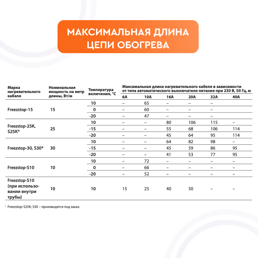 Максимальная длина нагревательной секции нагревательного кабеля Freezstop рассчитывается, исходя из температуры включения и типа автоматического выключателя питания: