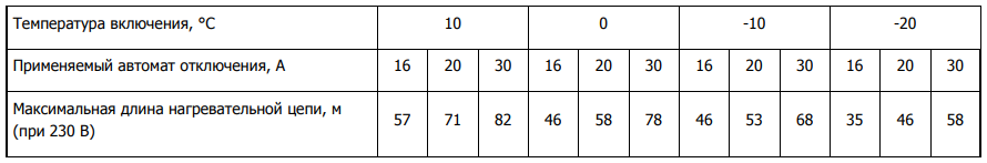 Максимальная длина нагревательной секции нагревательного кабеля xLayder рассчитывается, исходя из температуры включения и типа автоматического выключателя питания: