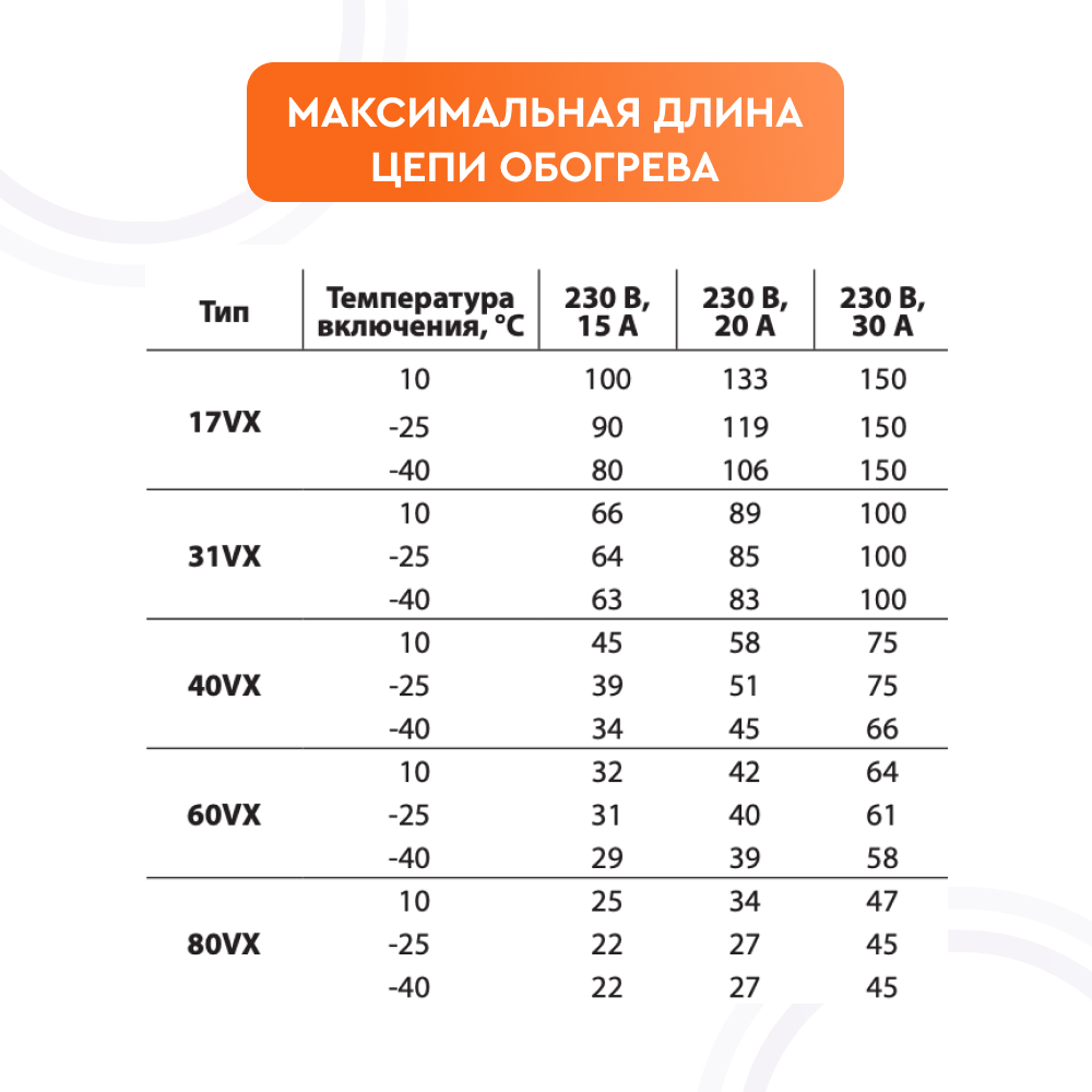 Максимальная длина нагревательной секции нагревательного кабеля Теплолюкс VX рассчитывается, исходя из температуры включения и типа автоматического выключателя питания: