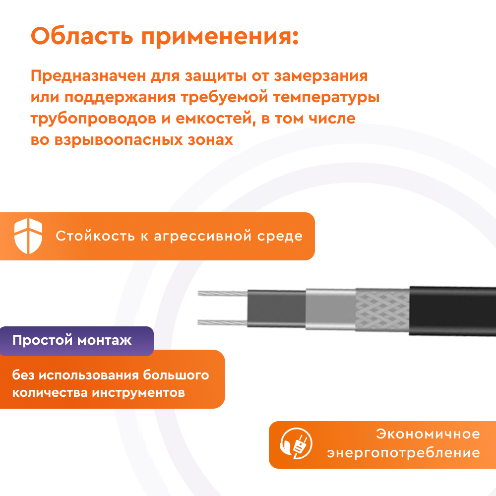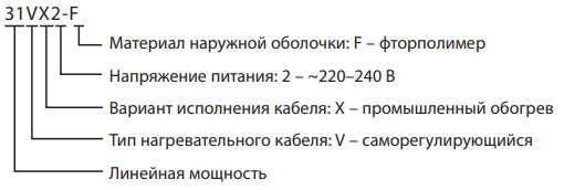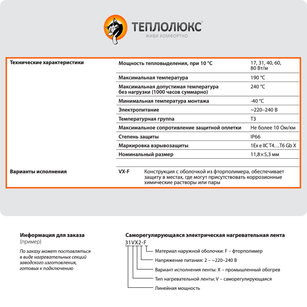 Саморегулирующаяся электрическая нагревательная лента 31VX2-F мощностью 31 Ватт на погонный метр предназначен для защиты от замерзания или поддержания требуемой температуры трубопроводов и емкостей, в том числе во взрывоопасных зонах. Максимальная допустимая температура без нагрузки (1000 часов суммарно) составляет +240 °С. Гарантийный срок на греющие кабели VX составляет 5 лет с момента продажи.