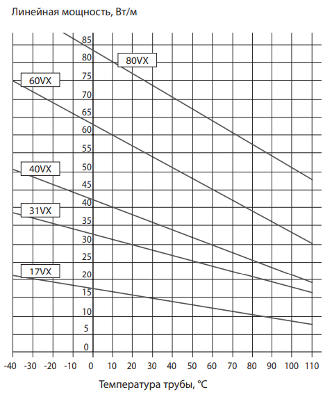 Номинальное тепловыделение в нормированных условиях для саморегулирующихся нагревательных кабелей Теплолюкс VX с рабочим напряжением 230В: