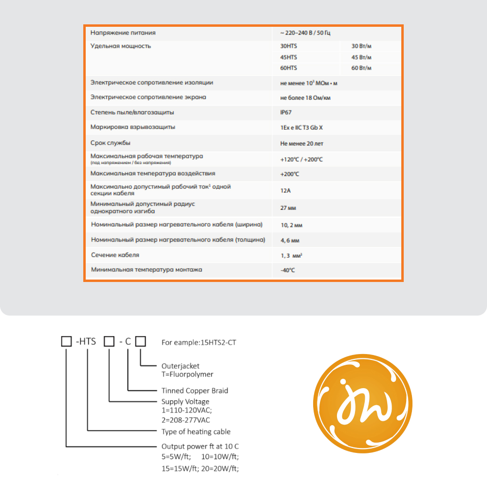 Структура кабеля 60HTS-2CT состоит из двух изолированных проводников, заключенных в саморегулирующуюся матрицу. Температура окружающей среды влияет на сопротивление матрицы, и это дает кабелю возможность самостоятельно изменять уровень тепла в каждой точке своей длины.