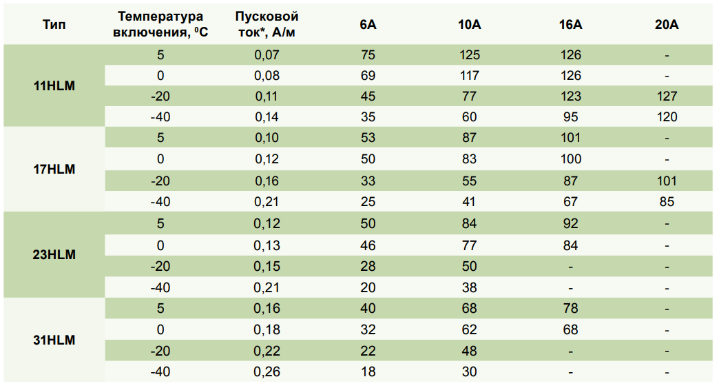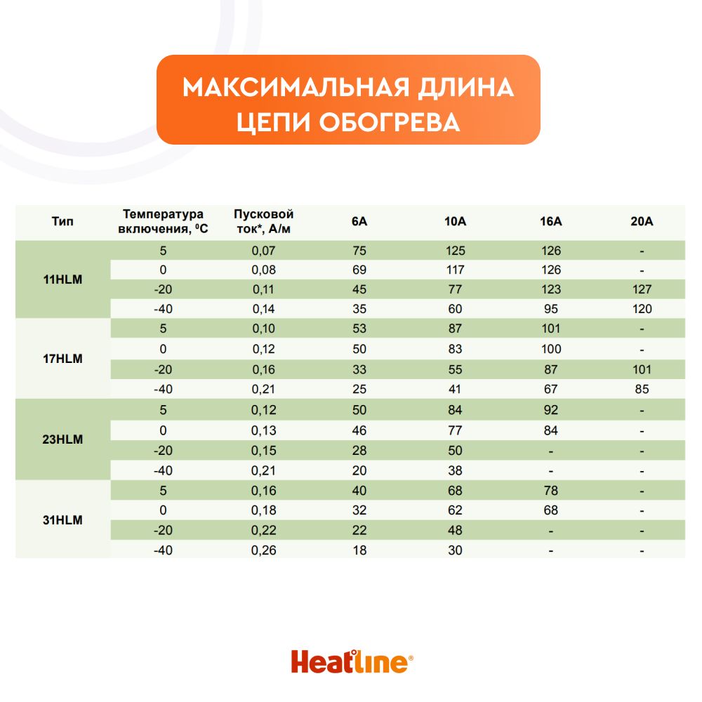 Максимальная длина нагревательной секции нагревательного кабеля HLM рассчитывается, исходя из температуры включения и типа автоматического выключателя питания: