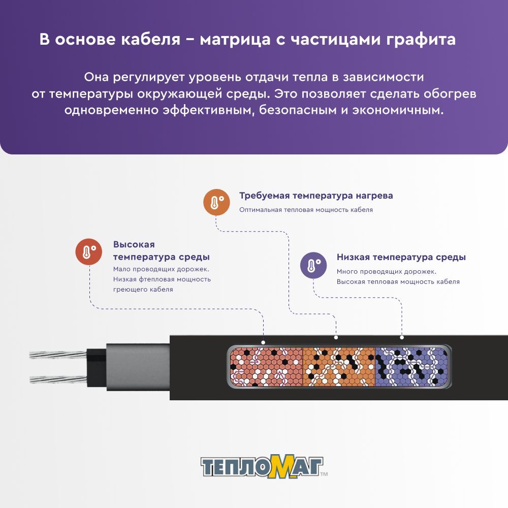 - Характеристики саморегулирования повышают безопасность и надежность кабеля. ФСМ не будет перегреваться или перегорать, даже когда его отдельные участки накладываются друг на друга. Его тепловыделение саморегулируется в ответ на изменение температуры;