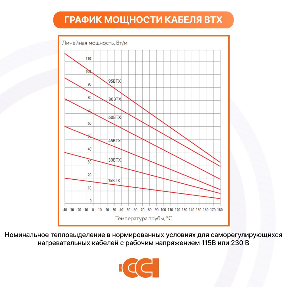 Номинальное тепловыделение в нормированных условиях для саморегулирующихся нагревательных кабелей ССТ ВТХ с рабочим напряжением 115В или 230В: