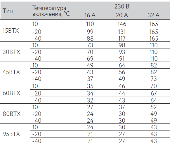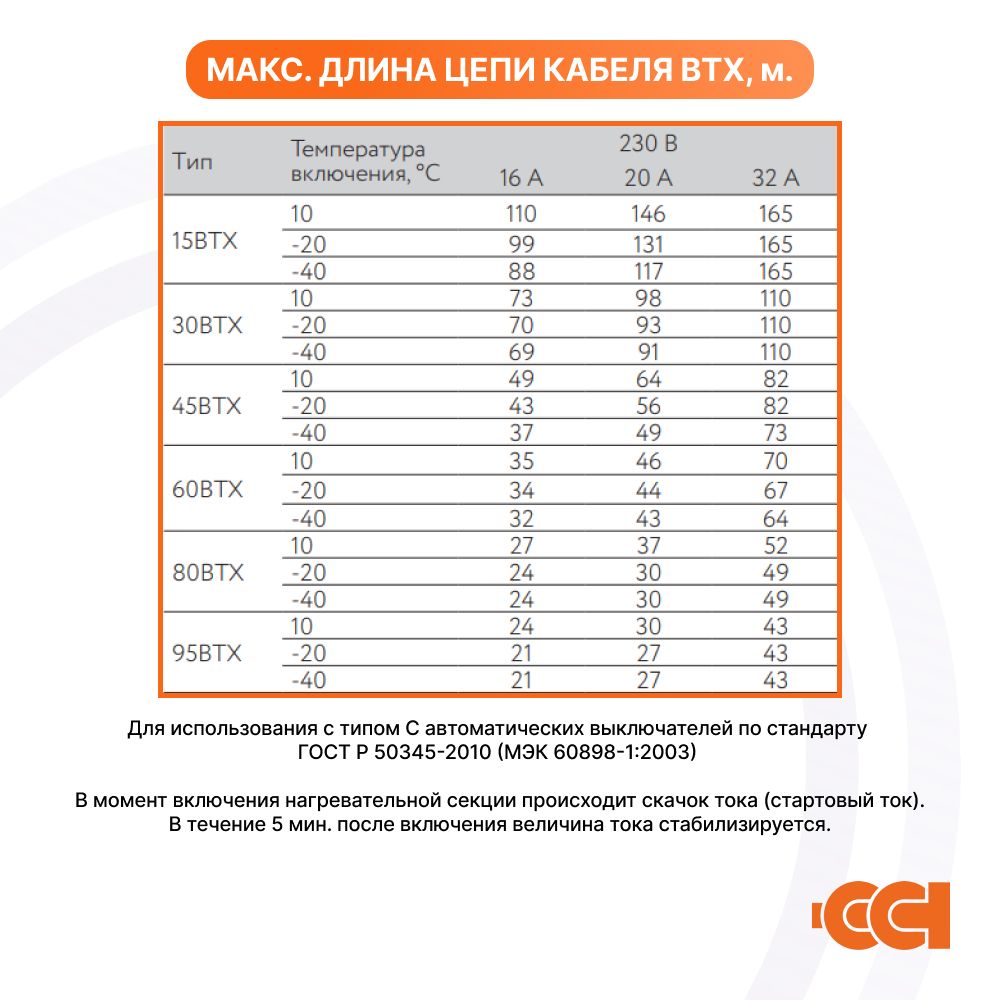 Максимальная длина нагревательной секции нагревательного кабеля ССТ ВТХ рассчитывается, исходя из температуры включения и типа автоматического выключателя питания: