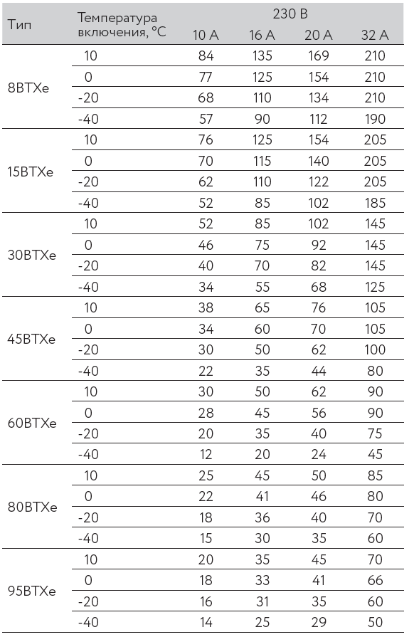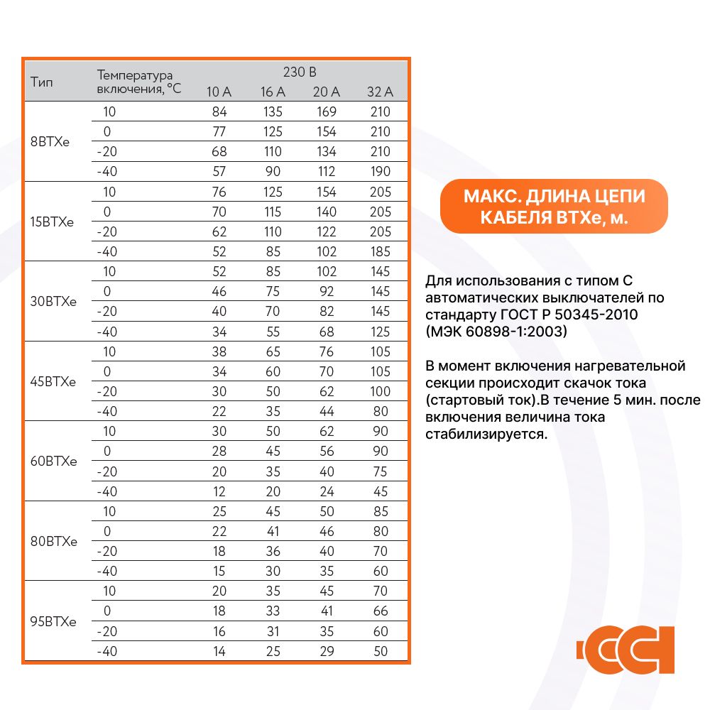 Максимальная длина нагревательной секции нагревательного кабеля ССТ ВТХе рассчитывается, исходя из температуры включения и типа автоматического выключателя питания: