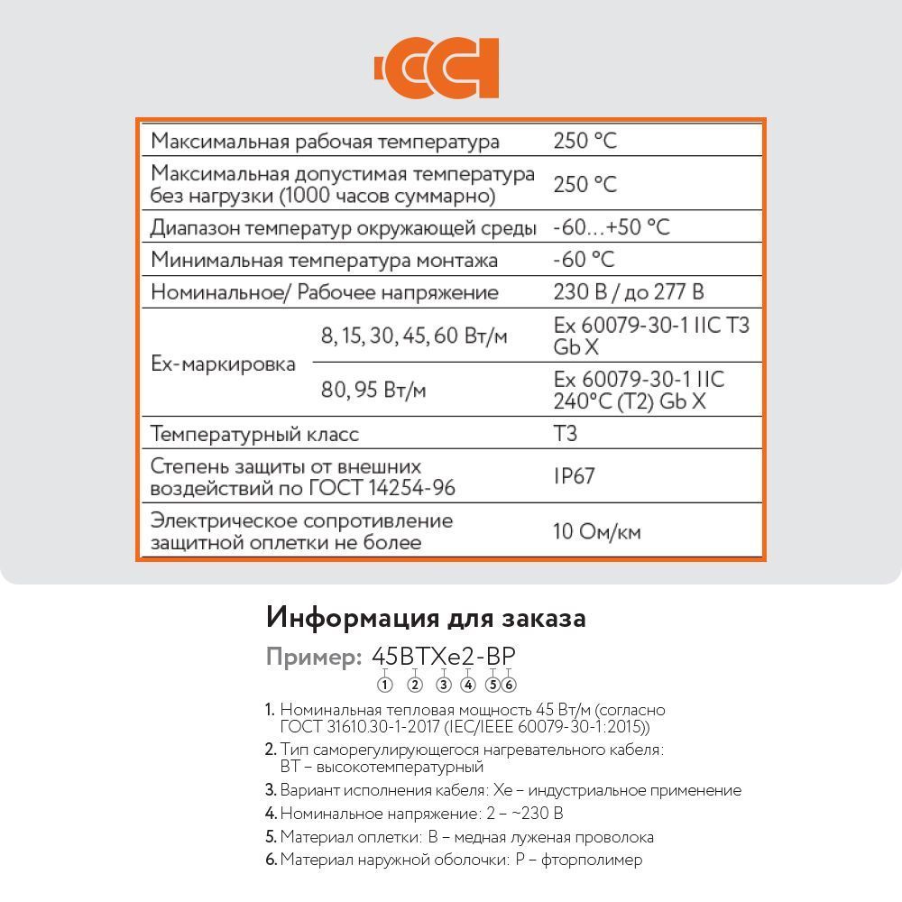 Основой саморегулирующегося греющего кабеля ССТ 15ВТХе2-ВР служит полупроводящая матрица с частицами графита, внутри которой расположены две токопроводящие медные жилы. Выделение тепла происходит в полупроводящей матрице, сопротивление которой зависит от температуры поверхности, что обеспечивает эффект саморегулирования (при повышении температуры сопротивление матрицы возрастает, тепловыделение падает и наоборот). Благодаря этому свойству, саморегулирующийся греющий кабель ССТ 15ВТХе2-ВР не будет перегреваться и перегорать даже когда его отдельные участки накладываются друг на друга. Срок службы греющих кабелей ВТХе составляет не менее 20 лет.