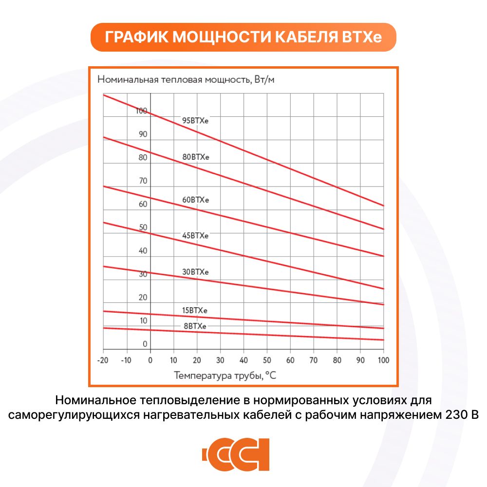 Номинальное тепловыделение в нормированных условиях для саморегулирующихся нагревательных кабелей ССТ ВТХе с рабочим напряжением 230В: