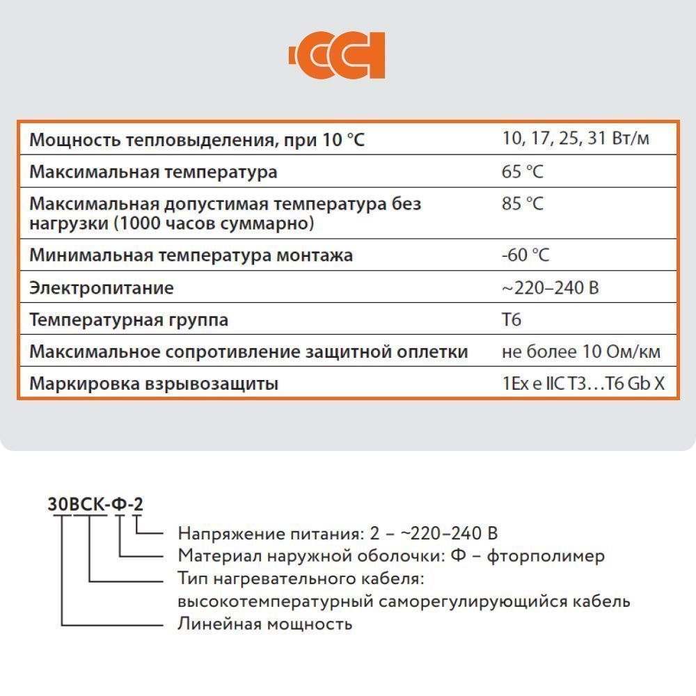 - Кабель ВСК возможно использовать во взрывоопасных зонах, согласно сертификации cоответствия требованиям Технического регламента Таможенного союза № 012/2011 «О безопасности оборудования для работы во взрывоопасных средах» TC RU C-RU.АА87.В.00243 на саморегулирующиеся электрические нагревательные ленты с маркировкой взрывозащиты 1Ex е IIC Т3…T6 Gb X;