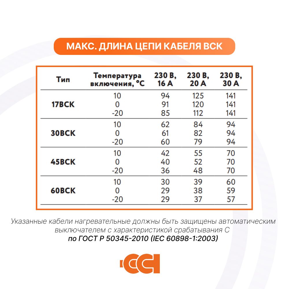 Максимальная длина нагревательной секции нагревательного кабеля ССТ ВСК рассчитывается, исходя из температуры включения и типа автоматического выключателя питания:
