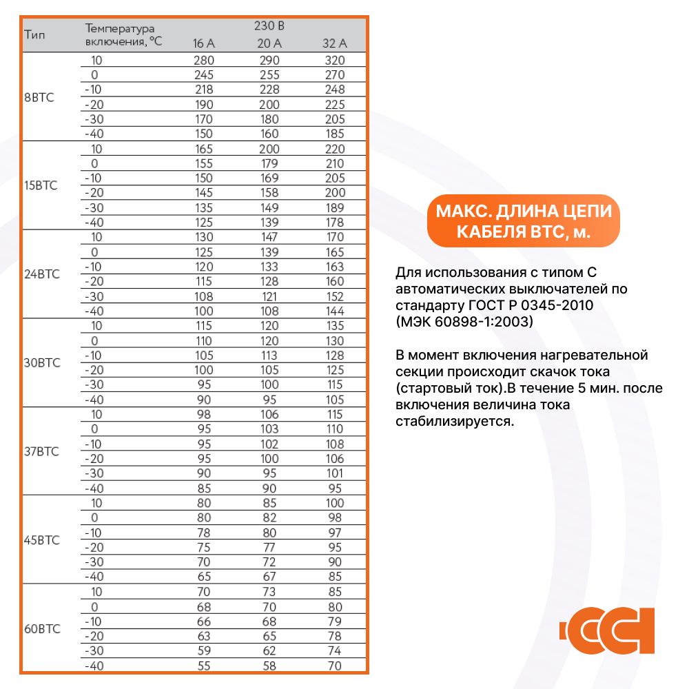 Максимальная длина нагревательной секции нагревательного кабеля ССТ ВТС рассчитывается, исходя из температуры включения и типа автоматического выключателя питания: