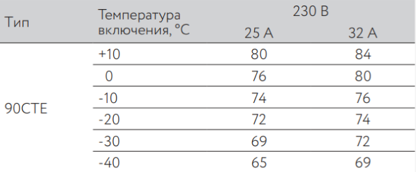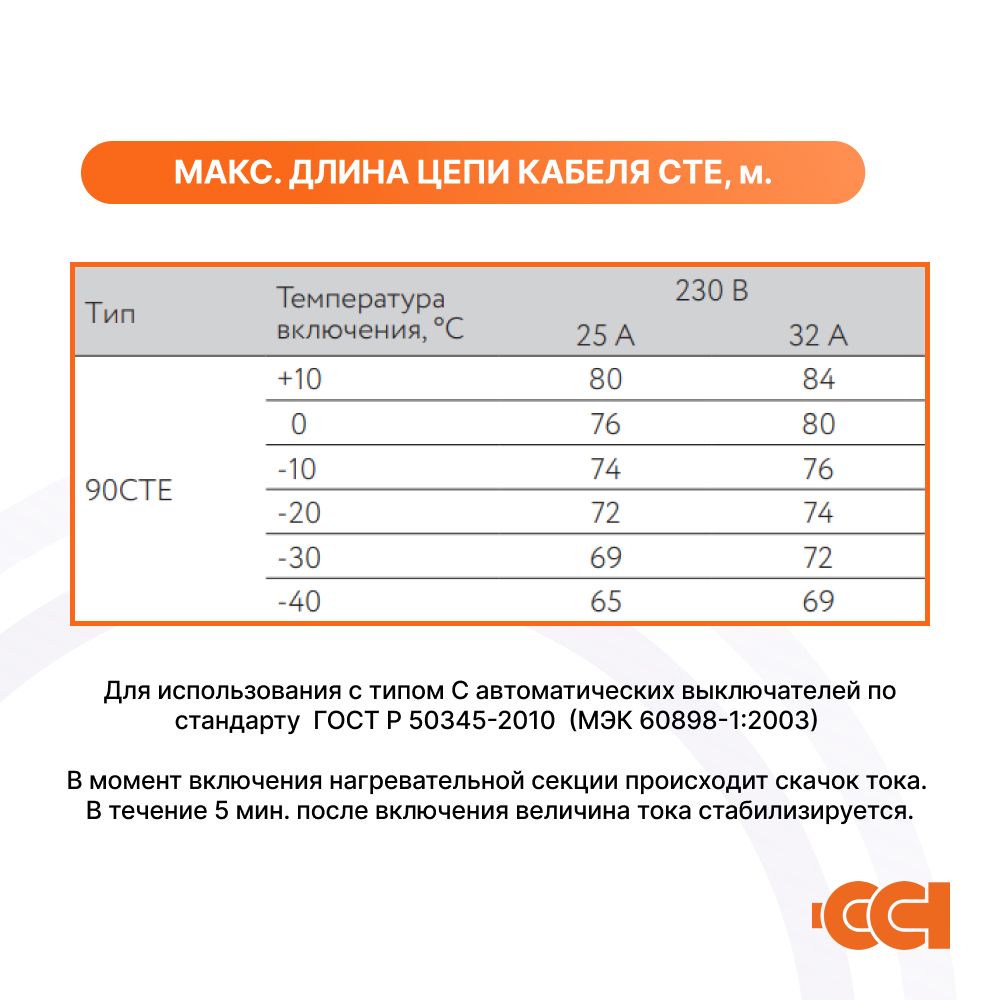 Максимальная длина нагревательной секции нагревательного кабеля ССТ ВТС рассчитывается, исходя из температуры включения и типа автоматического выключателя питания: