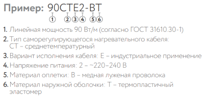 Основой саморегулирующегося греющего кабеля ССТ 90СТЕ2-ВТслужит полупроводящая матрица с частицами графита, внутри которой расположены две токопроводящие медные никелированные жилы. Выделение тепла происходит в полупроводящей матрице, сопротивление которой зависит от температуры поверхности, что обеспечивает эффект саморегулирования (при повышении температуры сопротивление матрицы возрастает, тепловыделение падает и наоборот). Благодаря этому свойству, саморегулирующийся греющий кабель ССТ 90СТЕ2-ВТ не будет перегреваться и перегорать даже когда его отдельные участки накладываются друг на друга.