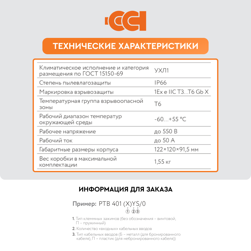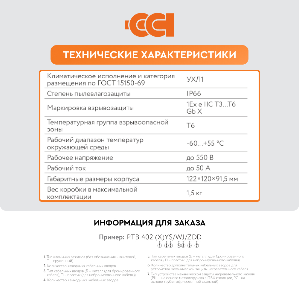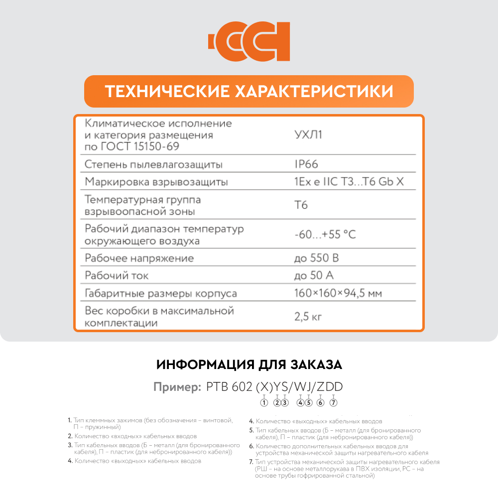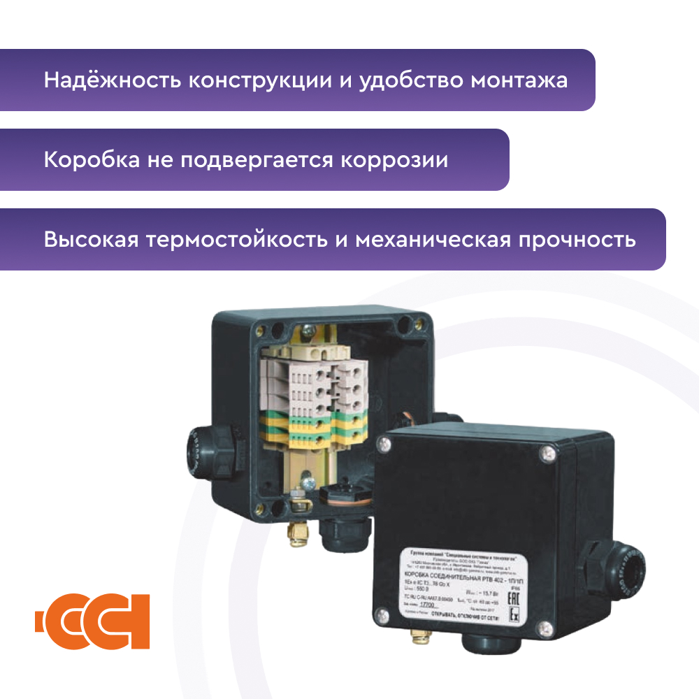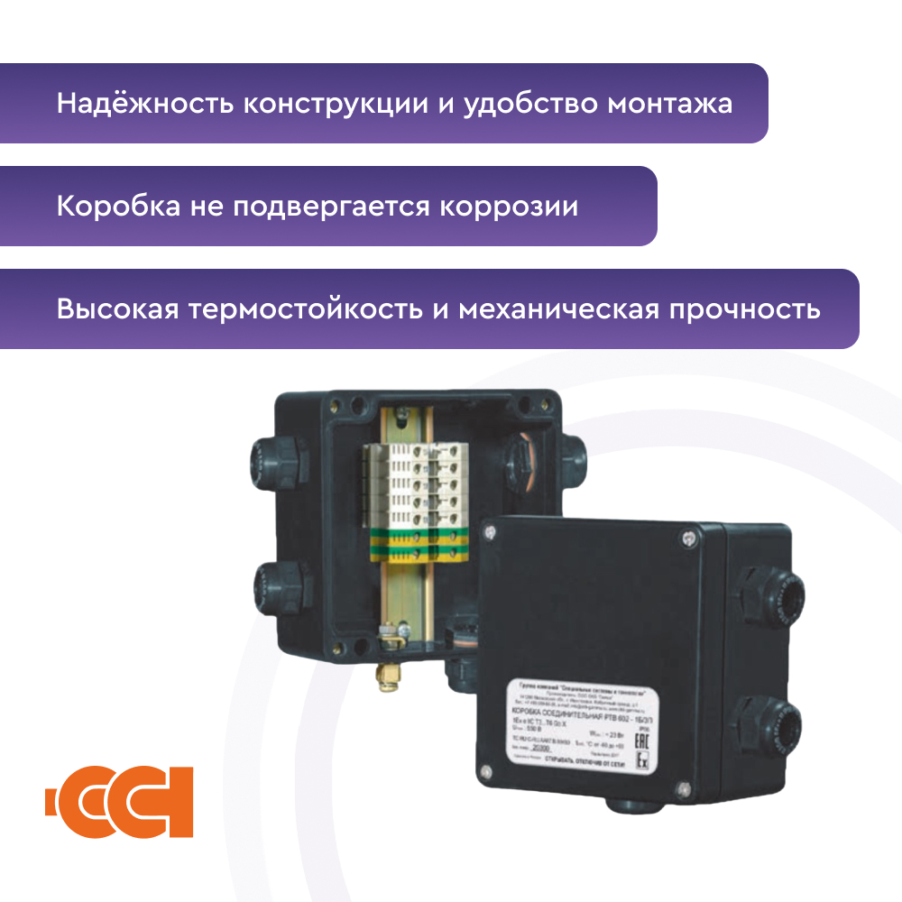 Конструкция корпуса обеспечивает защиту от проникновения влаги и пыли IP66 и высокую коррозионную стойкость. Применяемые клеммные наборы позволяют обеспечить подключение многожильных или одножильных проводов сечением от 1,5 до 10 мм².Гарантия на коробку РТВ 404-1Б/2П составляет 1 год с момента продаж