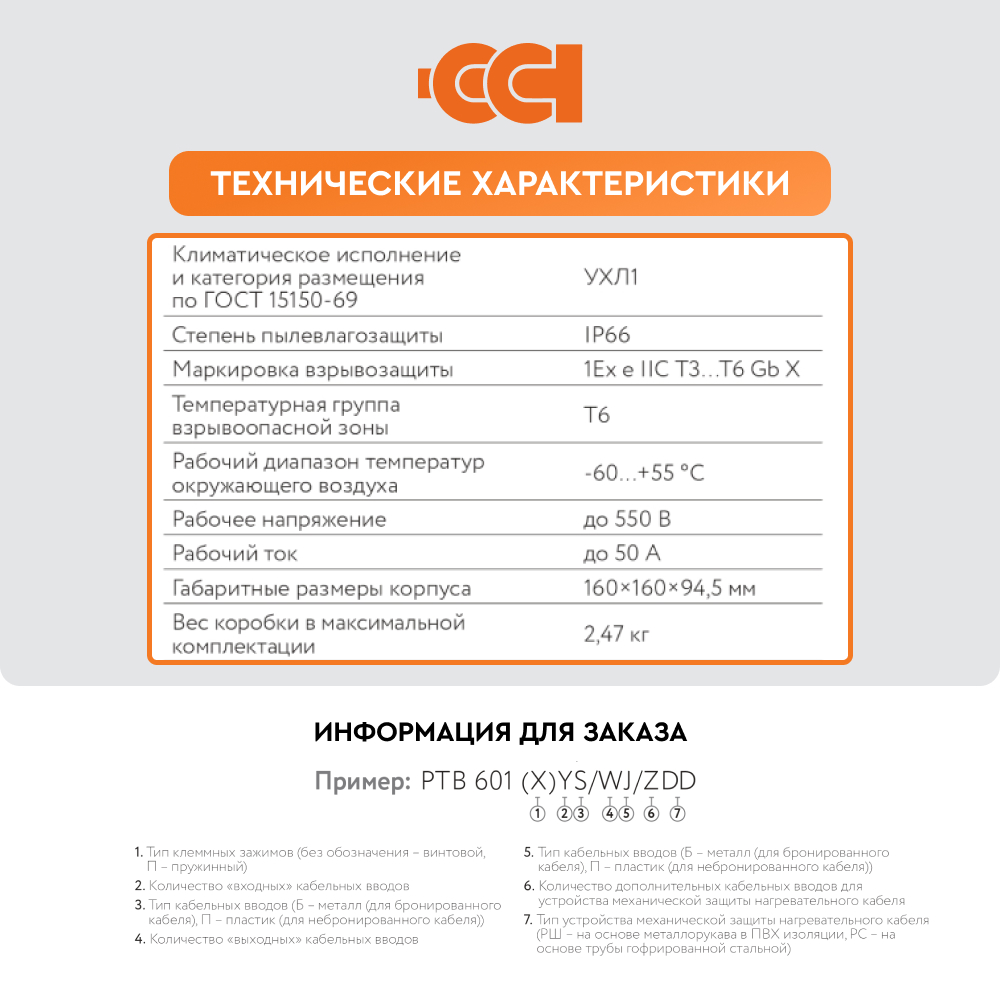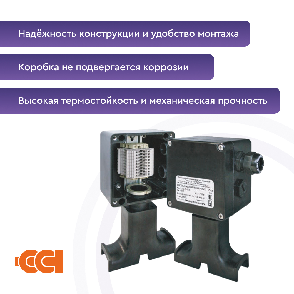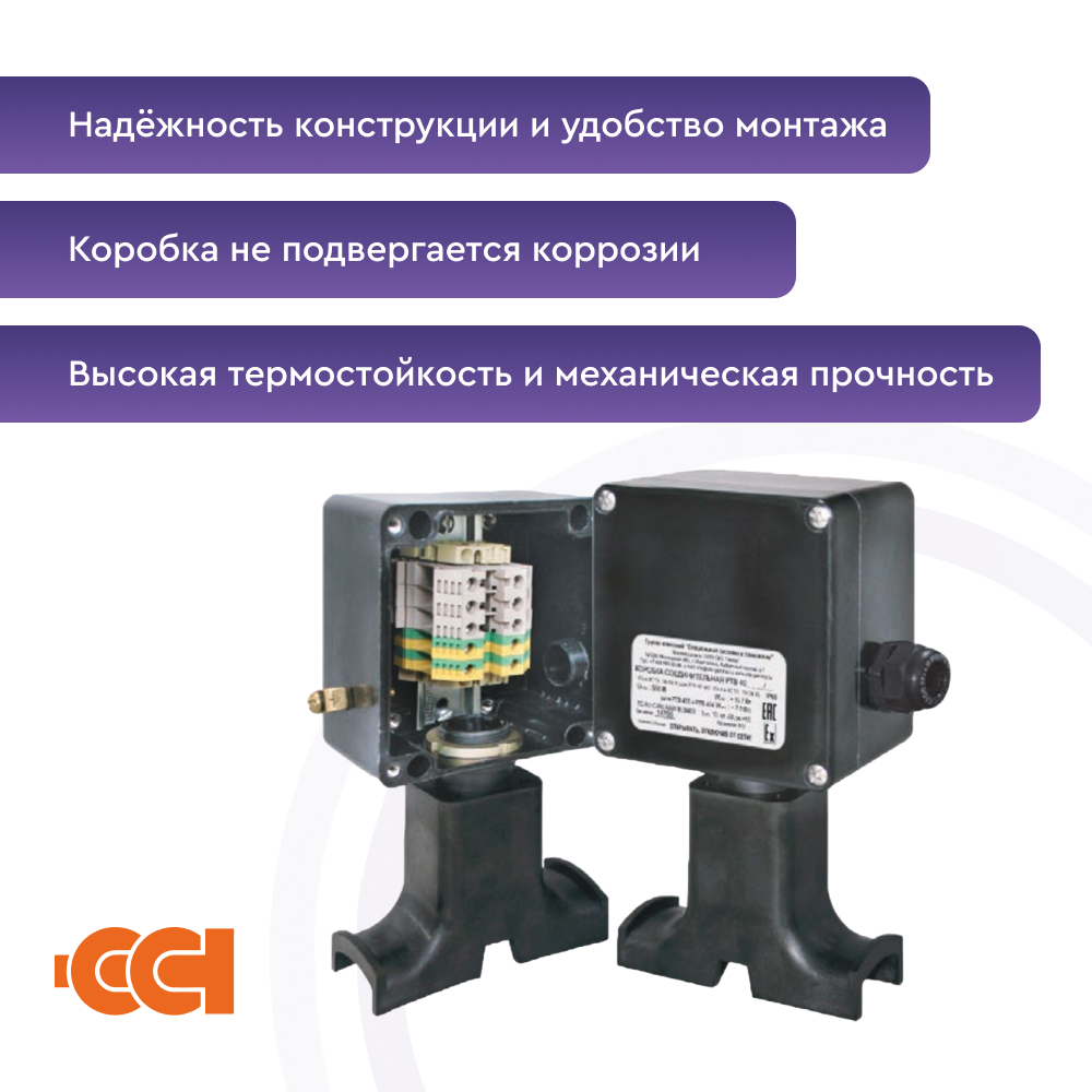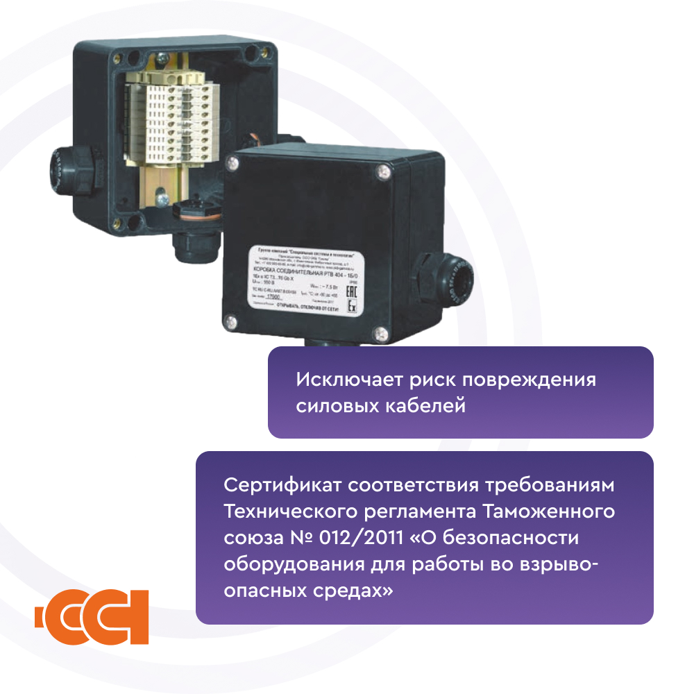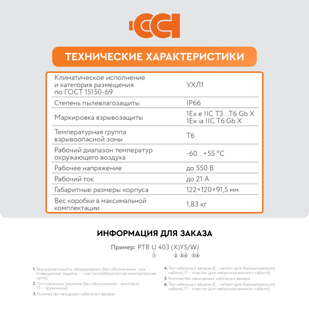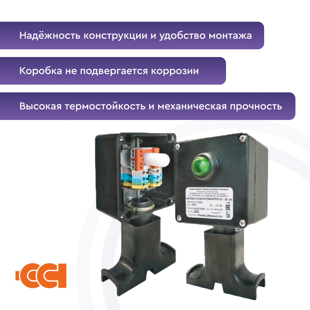 Конструкция корпуса обеспечивает защиту от проникновения влаги и пыли IP66 и высокую коррозионную стойкость. Применяемые клеммные наборы позволяют обеспечить подключение многожильных или одножильных проводов сечением от 1,5 до 10 мм².Гарантия на коробку РТВ 404-1Б/2П составляет 1 год с момента продаж